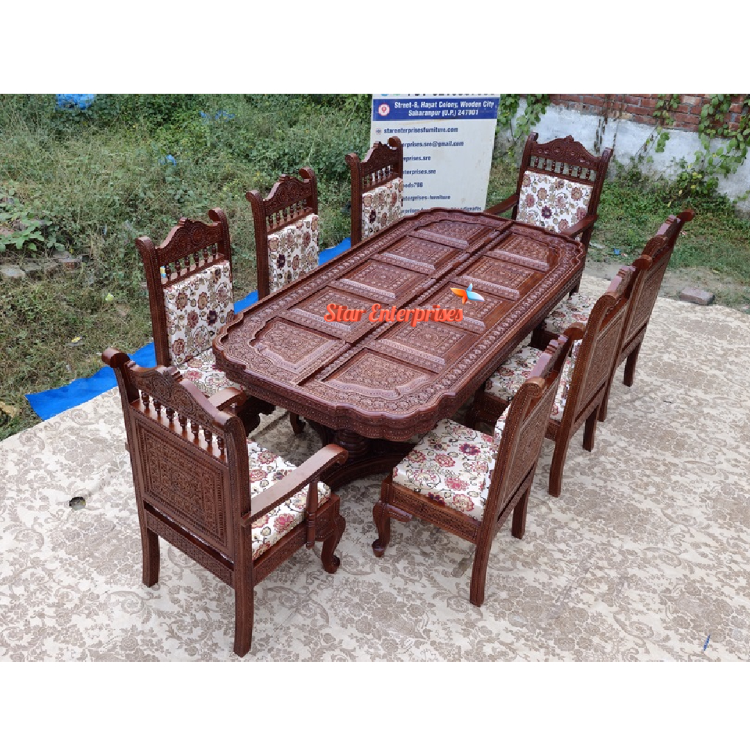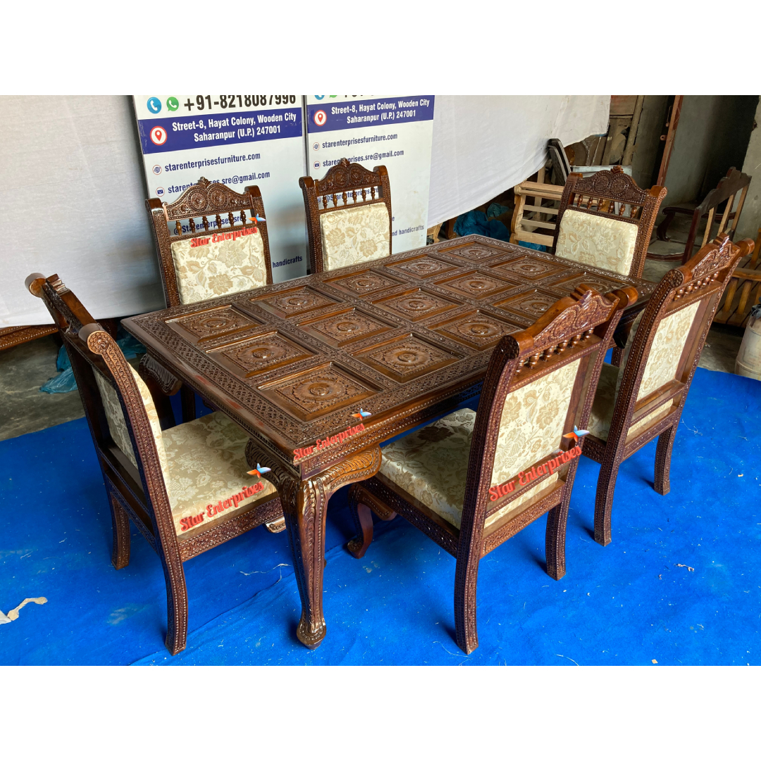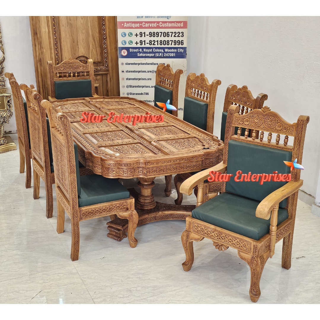 Top Wooded Engraved Dining Table Set by Star Enterprises which add a Royal Charm to Your Dining Area will make you experience a perfect blend of the old and the new comfort. These dining sets are made out of fine teak wood engraved beautifully by hand that portrays a charm of grace and resilience. Both designs are meticulously crafted to beautify your dining area besides being able to provide good construction & durability. Have a very royal outlook with Star Enterprises dining set making your dining room fashionable, warm & welcoming with a rich finish, meticulous carving & comfortable seating to your dining table.