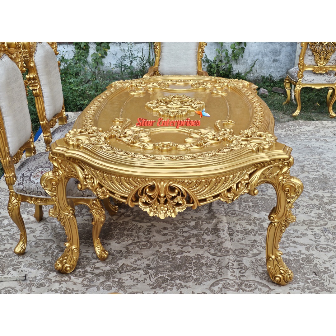Star Enterprises presenting an Antique French Style Dining Set crafted from high-quality teak wood, this dining set has an eye-catching shiny gold polish that adds glamour to your dining room. The focal point of the dining set is an oval shaped dining table and the floral hand carved works on it taking the skill work of our artisan.