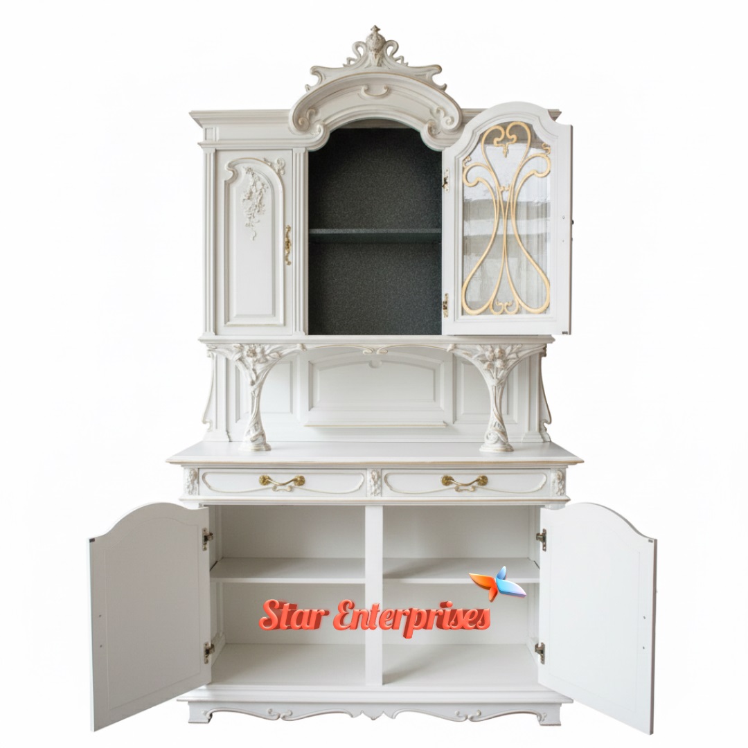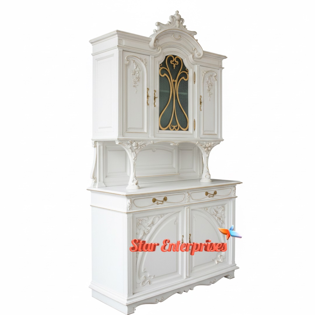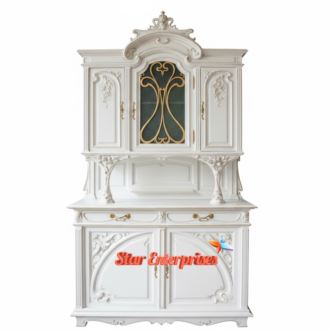 The pure luxury and the European touch are characteristics of this French Style Teak Wood Kitchen Sideboard by the Star Enterprises. This is made of high quality teak and has a beautiful high gloss white deco finish with the tinges of gold, with the graceful French curves and artistic hand carving. The top part has enclosed storage of crockery and glassware and the bottom part has expansive drawers and shelves to hold the kitchen needs.