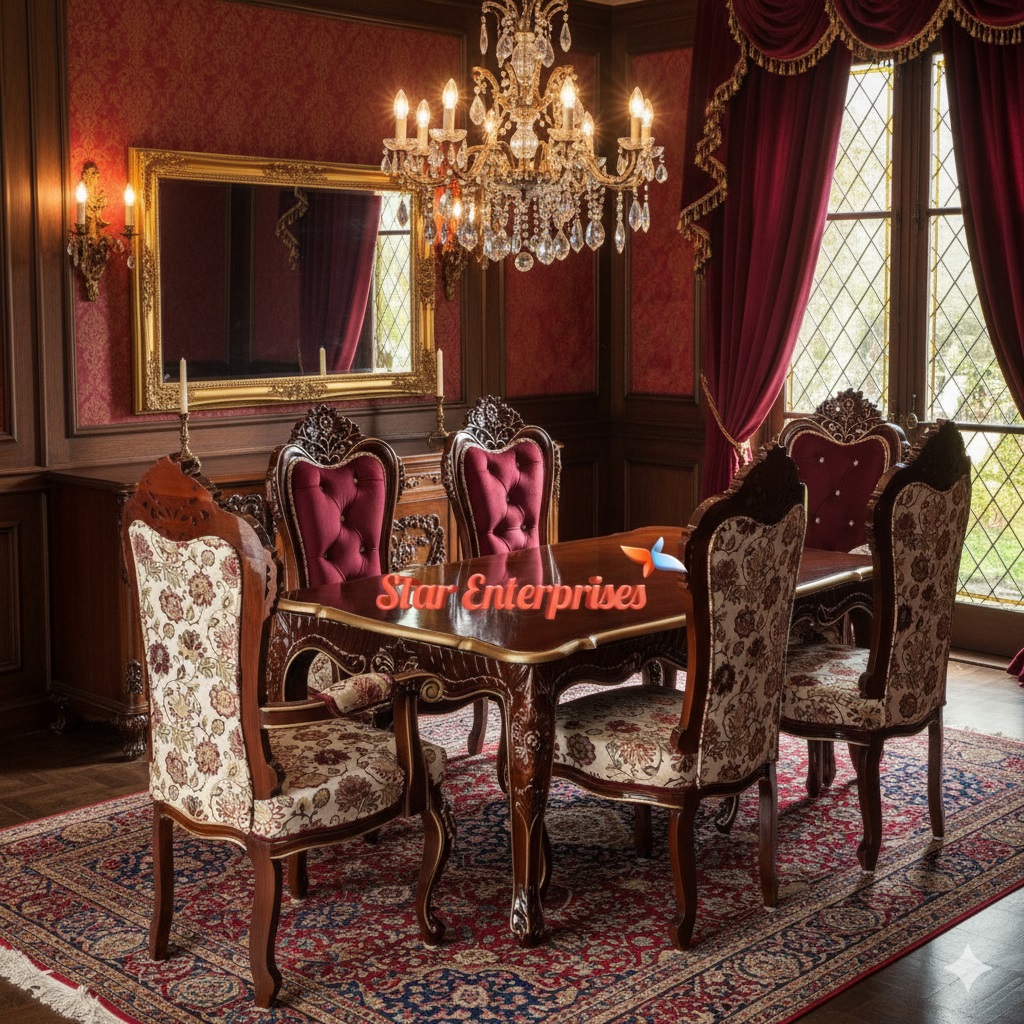 The Star Enterprises Premium Teak Wood Compact Design Dining Table is a beautiful mixture of classy design & reasonable price. This 6 seater dining set is made of fine teak wood and beautifully hand carved on the table and the chairs and has the fine carving in a compact modern way. This whole set is polished in a deep high gloss walnut finish to further decorate the set a light gold shading enhances the quality and gives the piece a royal touch. The chairs are created with comfort as well as aesthetic appeal.