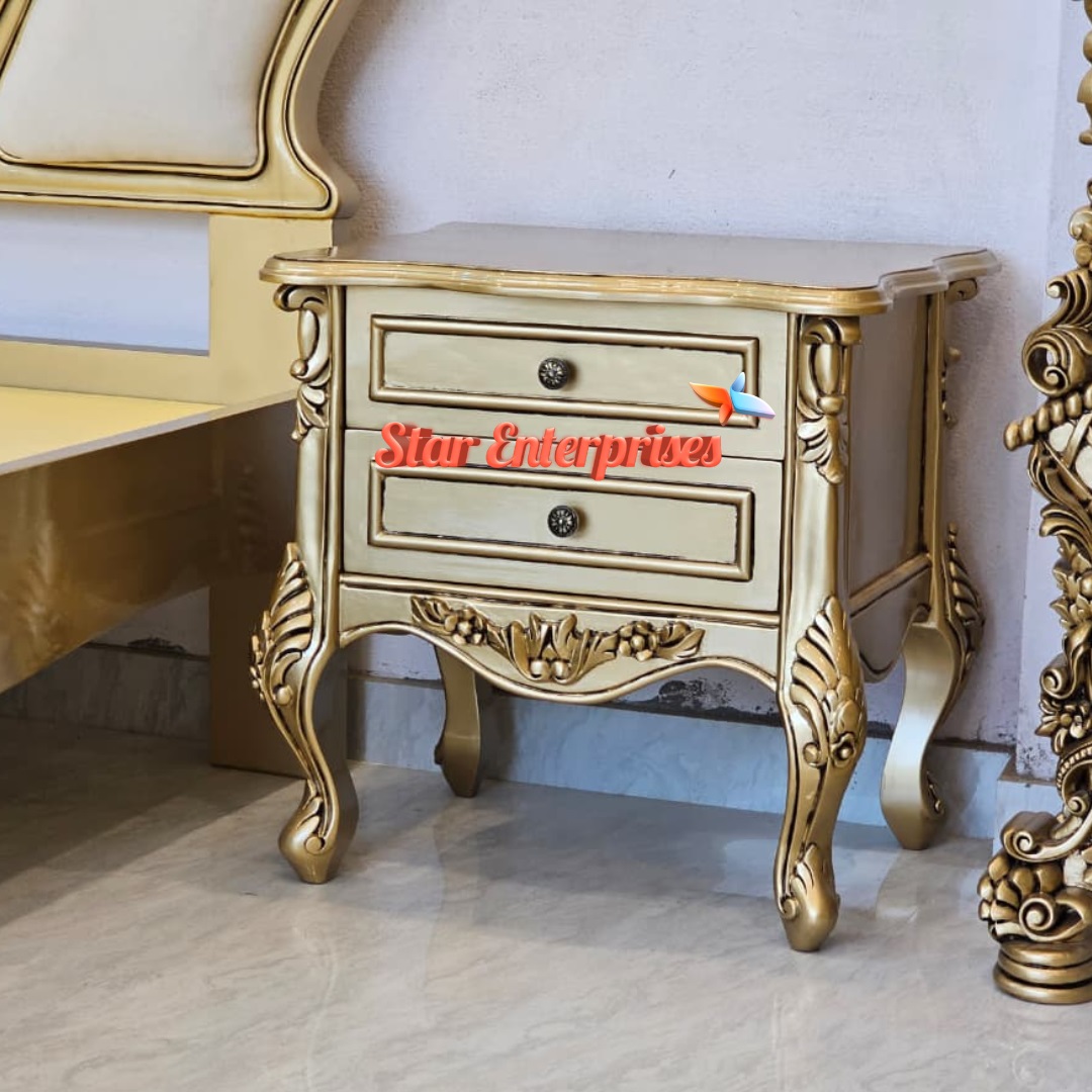Teak Wood Classic Bedside Table by Star Enterprises is an ideal combination of style, strength and practicality. This bedside table is made of high quality teak wood and polished in exquisite high gloss gold finish to have an all time royal touch. The work is also exquisitely decorated with gorgeous hand carvings, which depict the fineness of the artists.