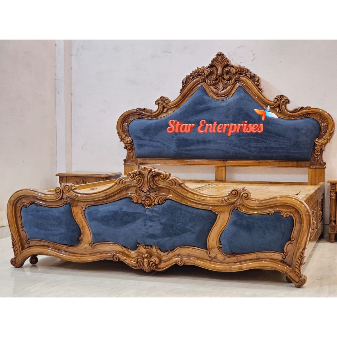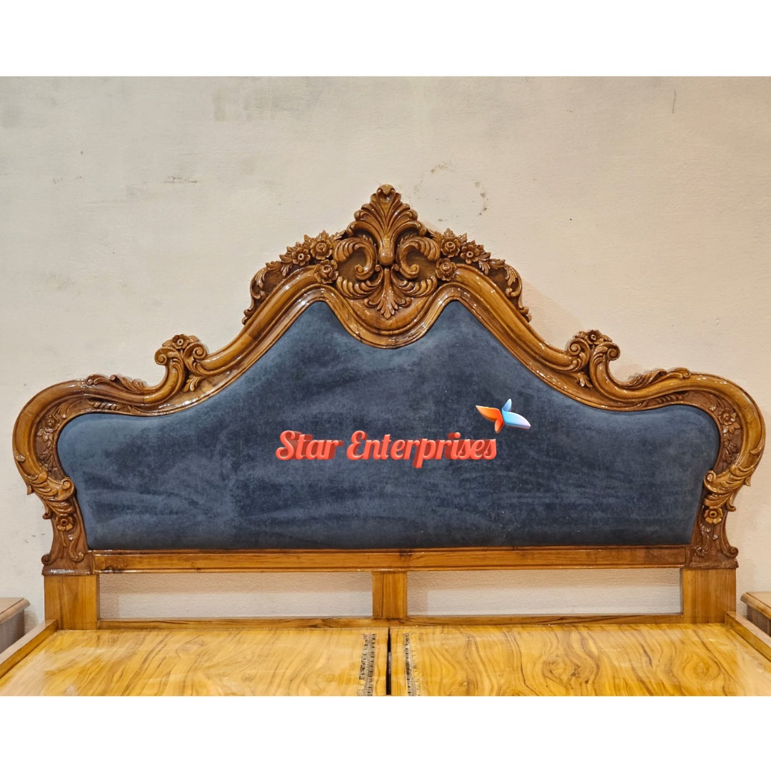 Star Enterprises Teak Wood Handcrafted Double Bed is a lavish masterpiece made out of the high quality of teak wood. The furniture is designed to feature a beautiful and well-placed double bed, two bedside tables and two low backrest chairs all polished in a rich high gloss teak finish that brings out the natural wood grains. The bed and side tables have a hand carving of floral artistry which will bring royalty to your bedroom decorations.