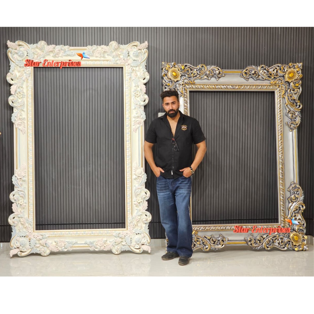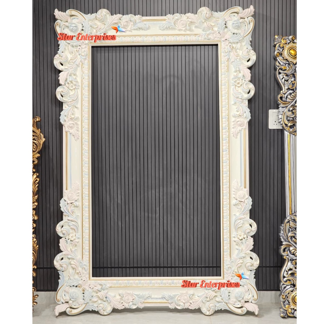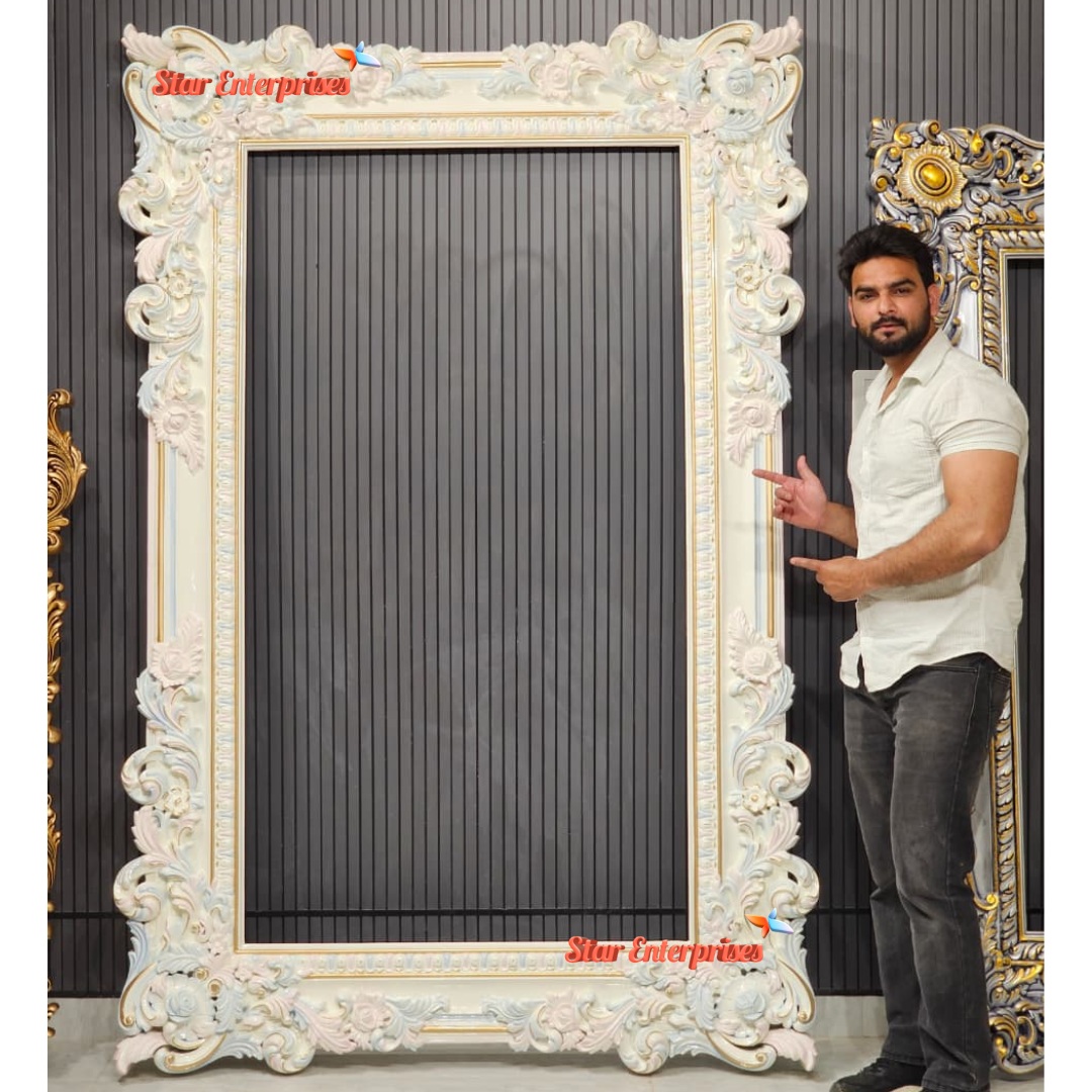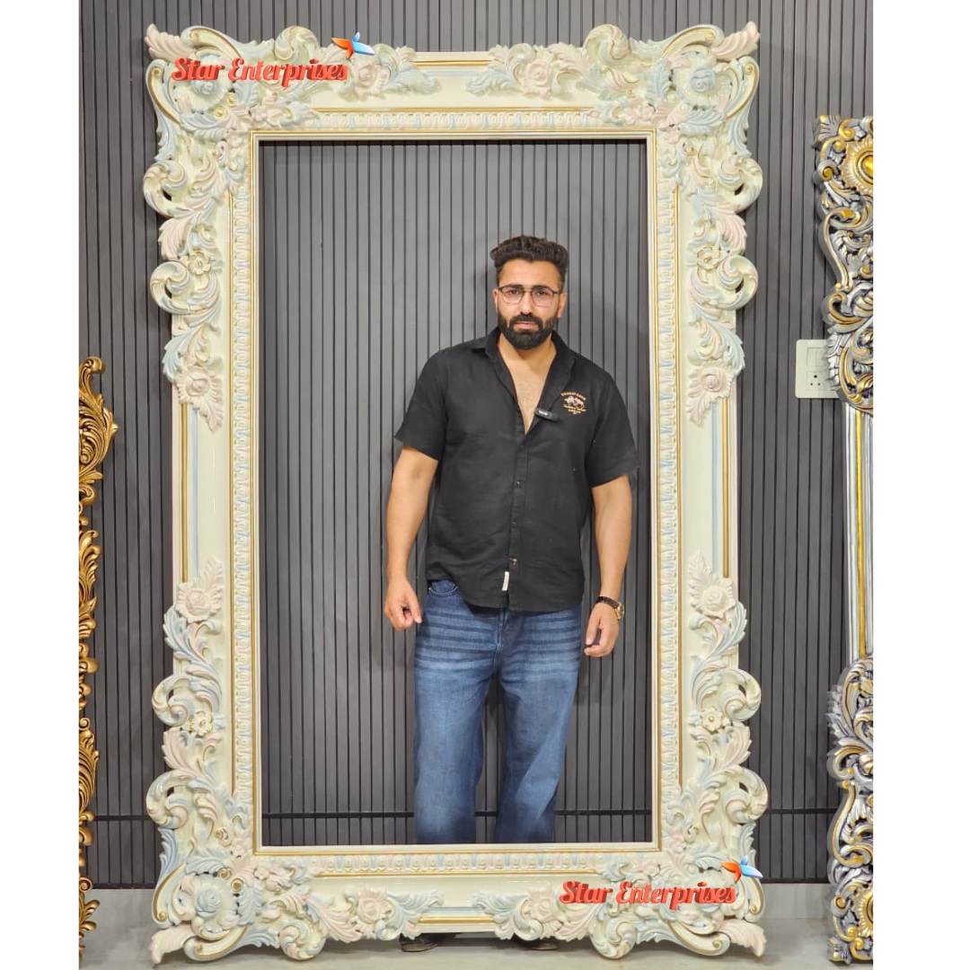 It is almost 8 feet in height and displays a blend of traditional craftsmanship and grandeur. It can be used as a wall decoration, portrait art frame, or mirror frame and immediately change the atmosphere of your house to a royal one. Star Enterprises guarantees high quality, global delivery and full customization to the needs of buyers.