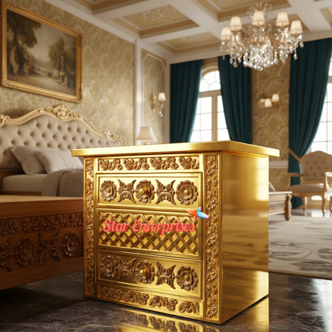 Star Enterprises presents the Teak Wood Royal Bedside Table, a perfect blend of luxurious elegance and functionality. Crafted from premium teak wood, this bedside table is polished in a shiny gold finish that highlights its natural grain and adds a touch of luxury. The intricate hand carvings showcase traditional artistry, making it a timeless addition to any bedroom.