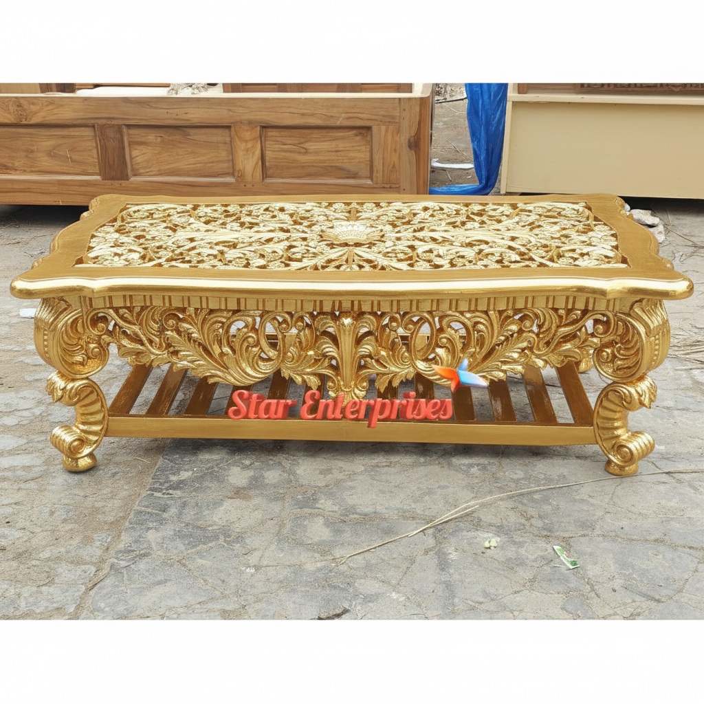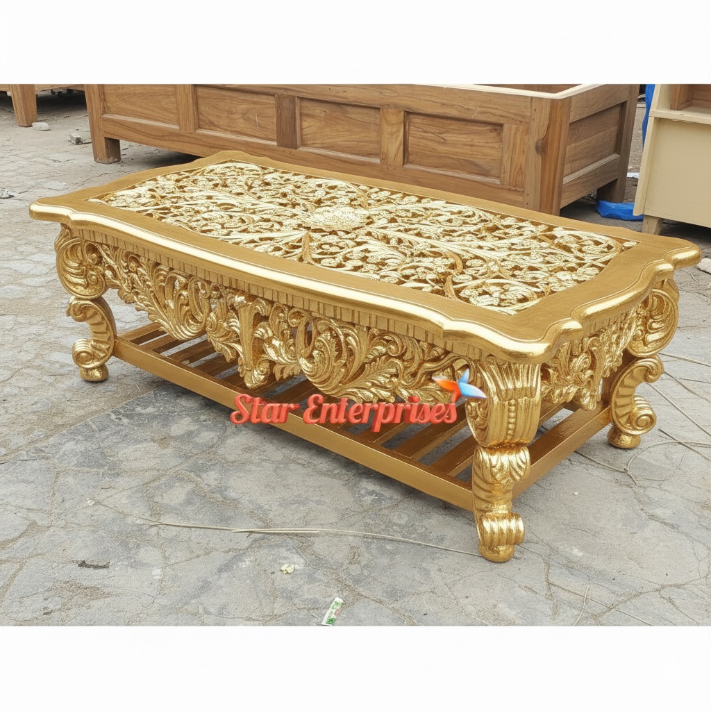 Star Enterprises presents the Teak Wood Royal Center Table, a perfect blend of elegance and functionality. Expertly crafted from premium teak wood, this center table features a glossy gold finish that enhances its rich and luxurious appeal. The table boasts heavy floral hand-carved detailing on the tabletop, sides and legs, showcasing impeccable craftsmanship and artistry.