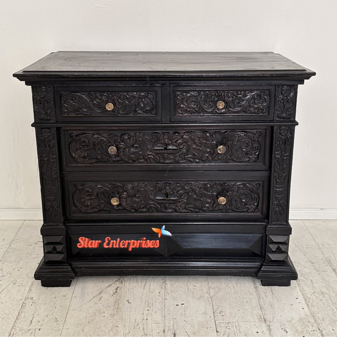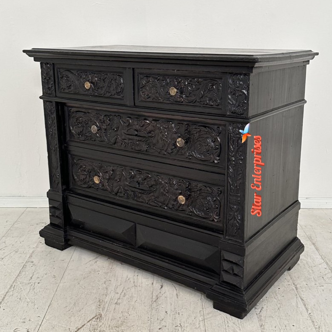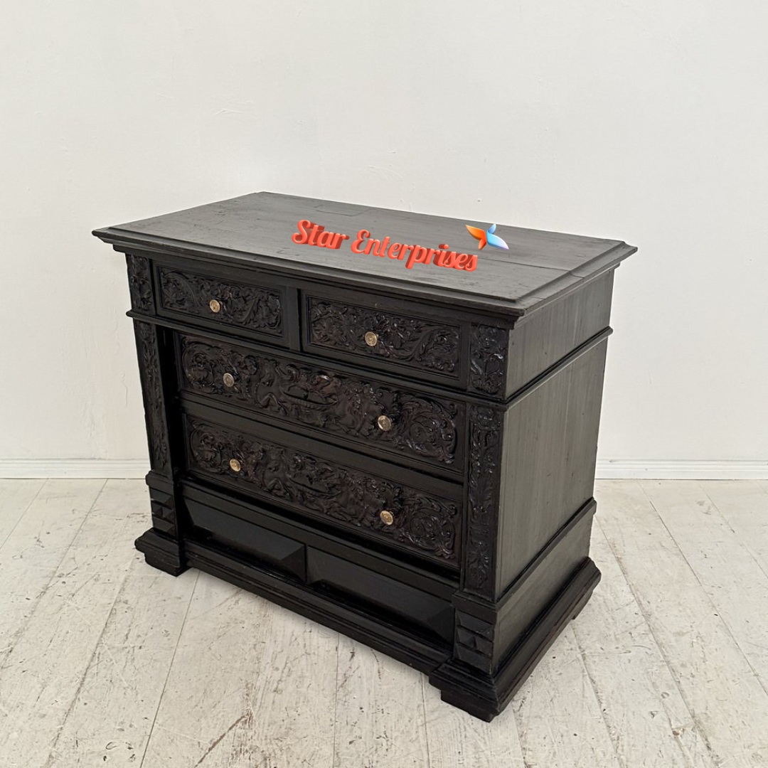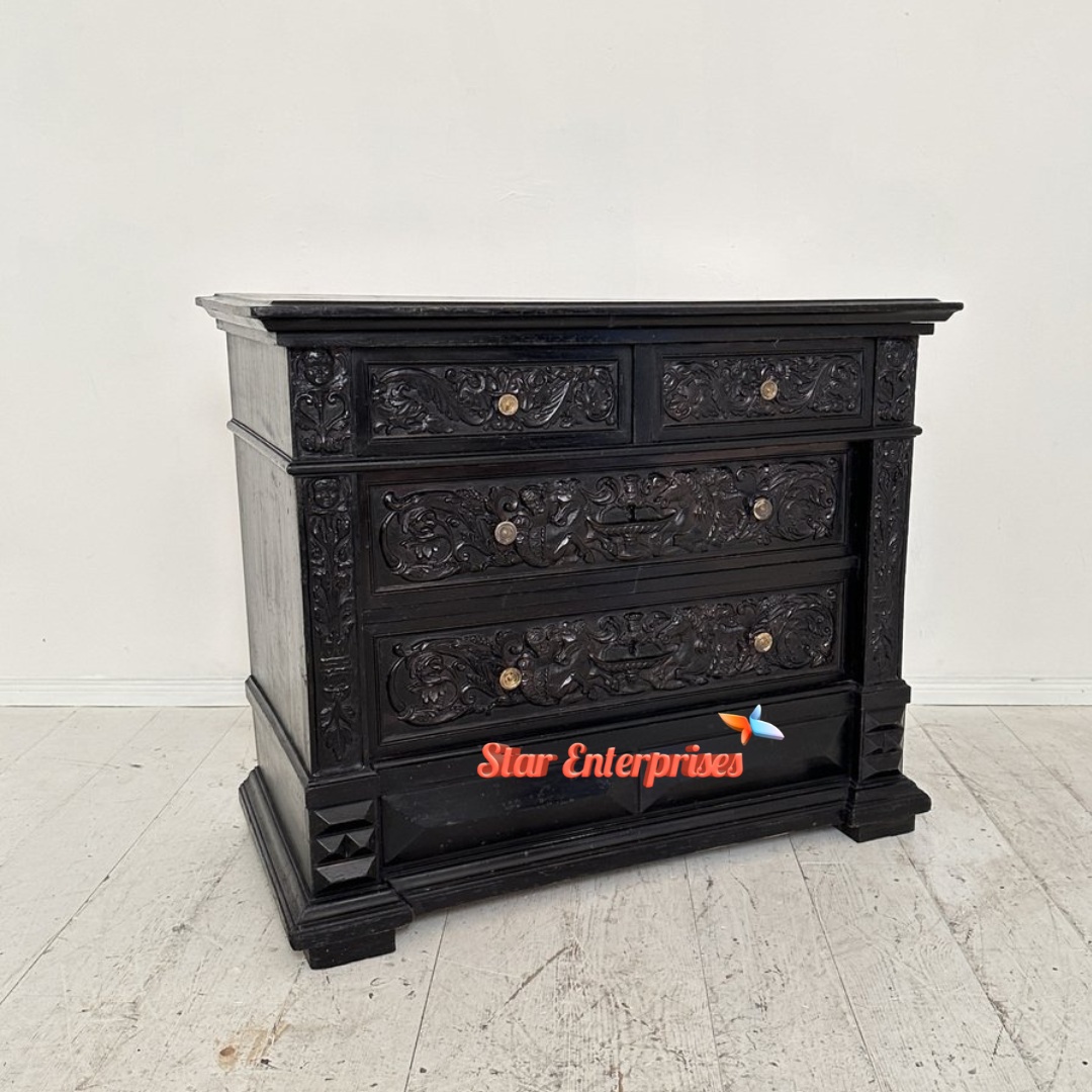 Designer handles and knobs are endowed to the drawers which complements its antique appearance. This chest of drawers is finished in a deep matte rustic black polish, which has given it depth, character and sophistication to any interior. It is a timeless piece of home decoration ideal to install in bedrooms, living rooms or posh villas since it is a symbol of durability, beauty and good taste.