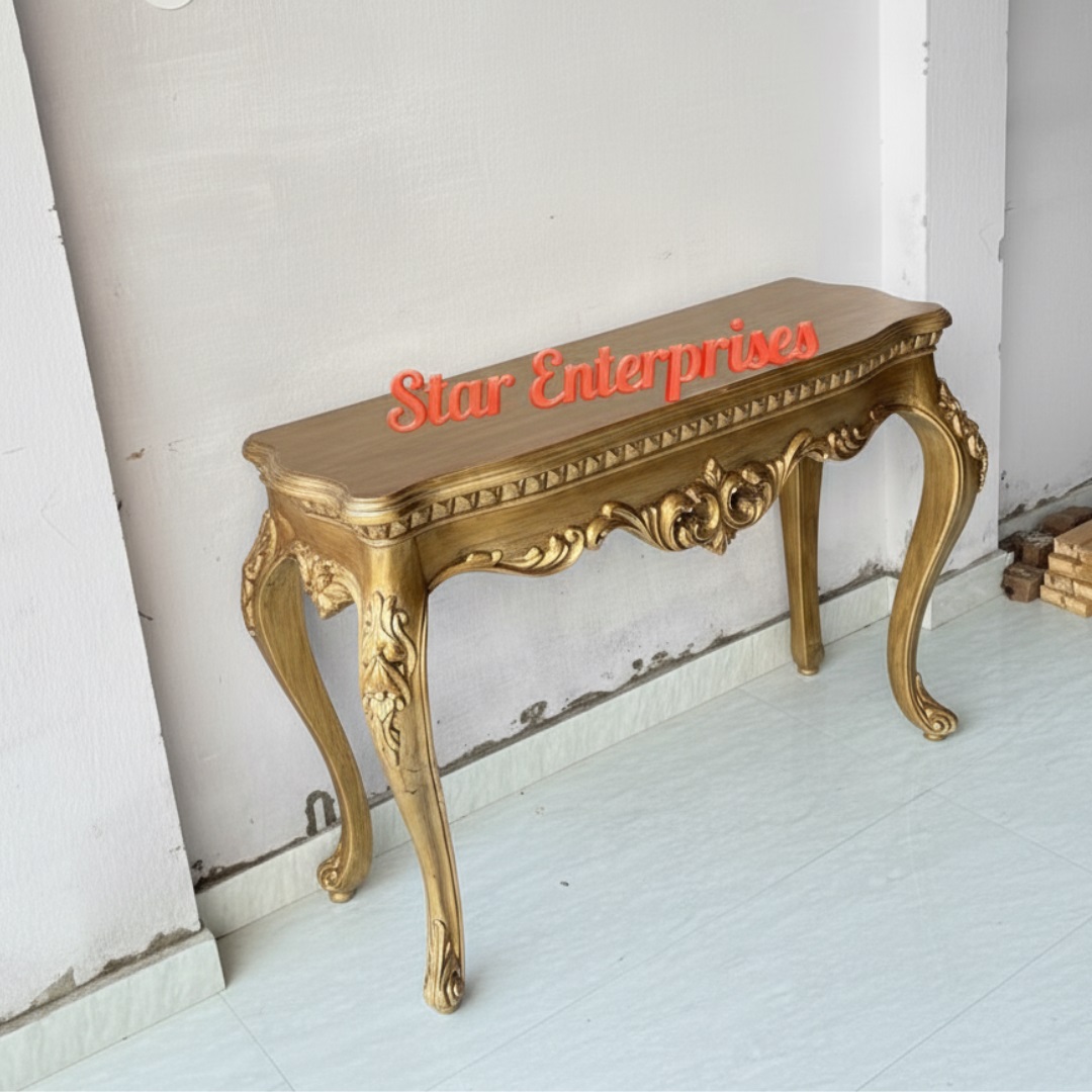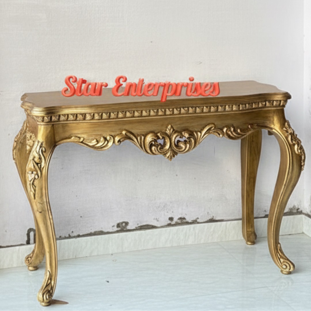 The Star Enterprises Teak Wood Vintage Console Table is wonderful elegant piece of wooden art. The antique gold high-gloss finish, applied to the rich grain on high-quality teak wood, makes this console table look impressive. The set includes a matching mirror frame, making the set luxurious and truly glamorous.