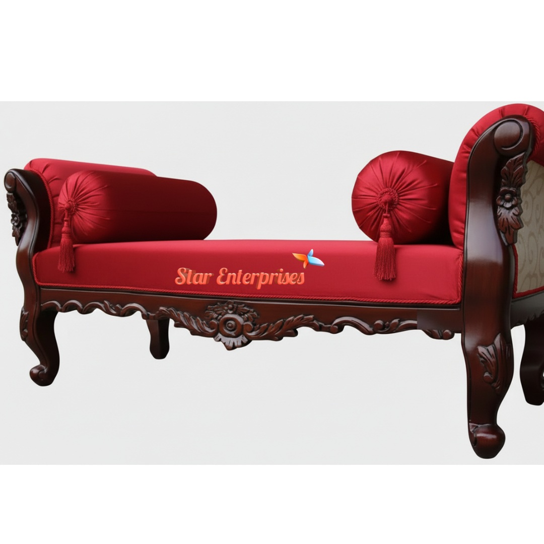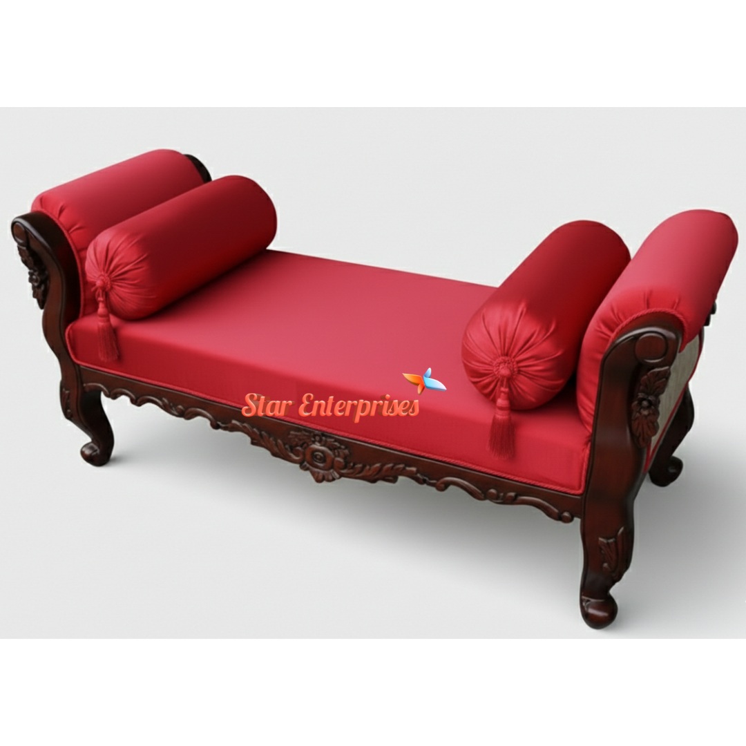The chairing is stuffed with warm and cozy dark red material making a comfortable touch and a contrasting image with the wooden frame. This bench is designed with a lot of room and can be used in the living rooms, bedrooms, foyers or in the interiors of the heritage style. It will be a practical seating arrangement and a stylish addition to any space because of its fine artisanship and beautiful appearance.