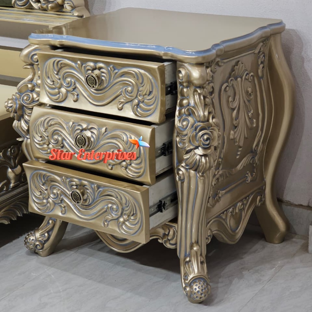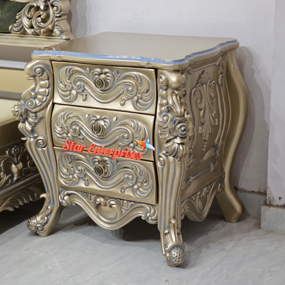 The table has three large drawers, which are all you need to keep your daily needs, accessories and important items at your convenience. The drawers have smooth soft-closing mechanisms that will make the operation of the drawers silent and effortless. The quality of knobs used is of designer quality, which adds to the luxurious appearance and provides a comfortable feel. This bedside table has been completed in a high-gloss antique gold finish with graceful light shades of blue that make it an exclusive royal statement that suits a classic or luxury bedroom decoration perfectly.