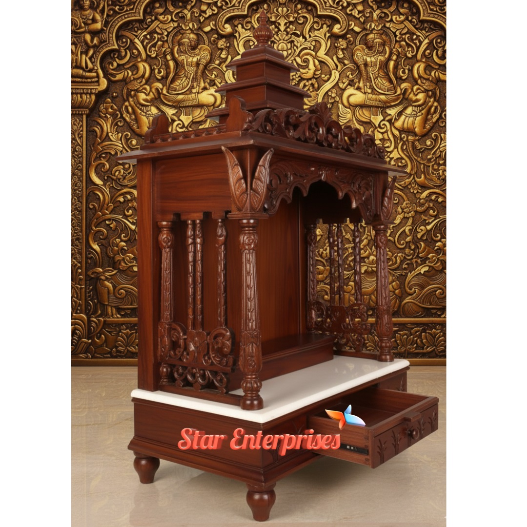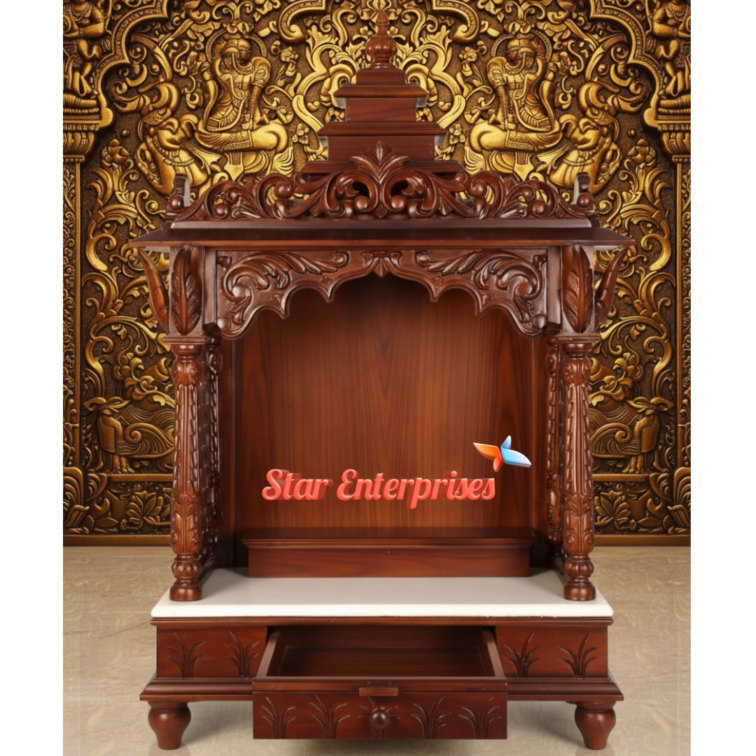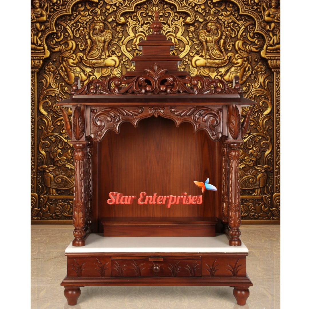 Wooden Antique Temple Design by Star Enterprises is one of the masterpieces designed using the best premium teak wood and Indian traditional art and divine craftsmanship. The temple has the beautifully hand carved pillars, ornamental arches and a dome-shaped top which gives the temple a royal spiritual touch. Its large interior space will give enough space to place idols and pooja material.