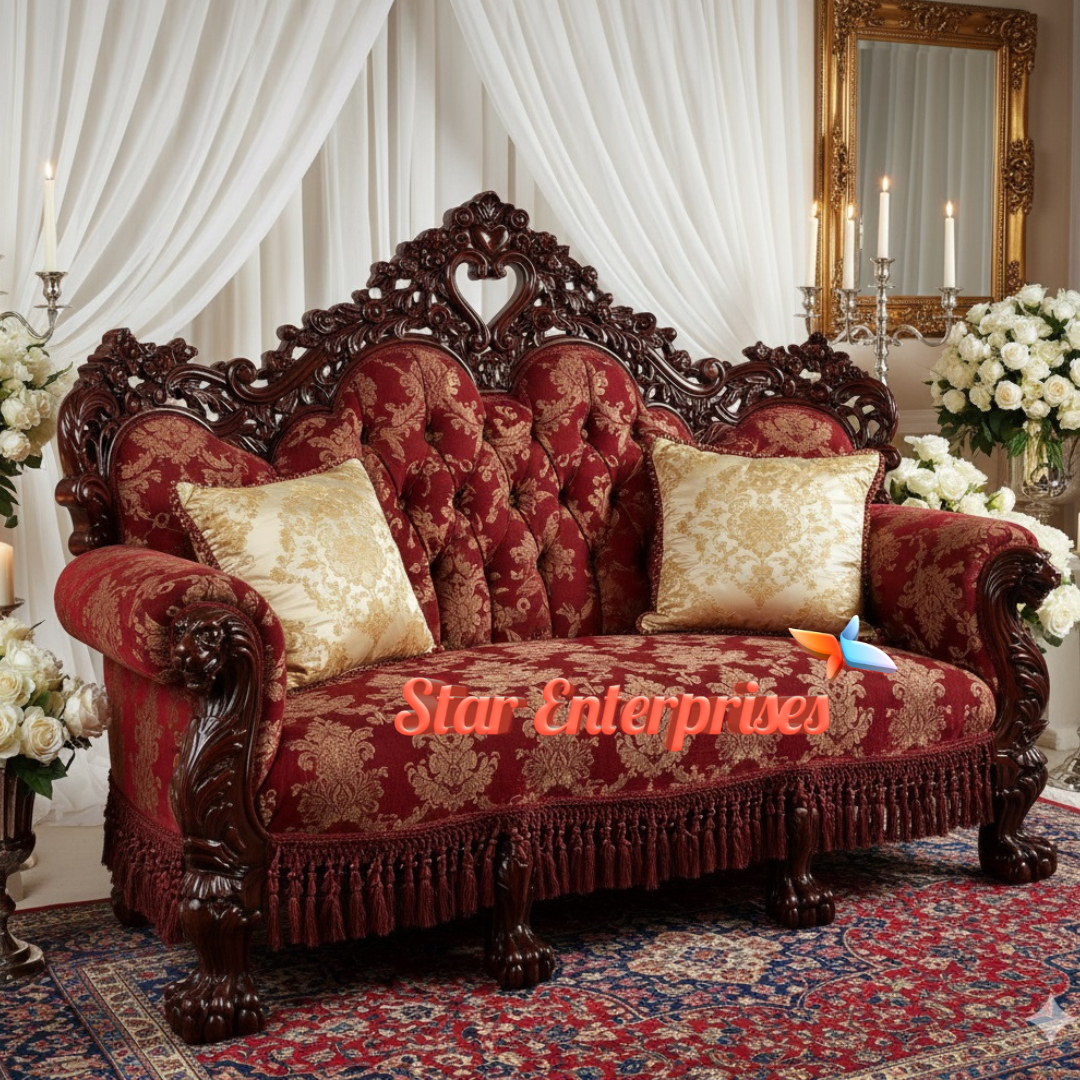 The tufted backrest will also provide a stylish touch as well as a comfortable one and is suitable in grand events and wedding set ups. The upholstered sofa is made of warm and charm with the fabric being maroon floral prints and is well matched with its carved wooden frame. This beautiful created work by Star Enterprises is set to add some royal feel to any wedding or royal interior and is a combination of both art and classic beauty.