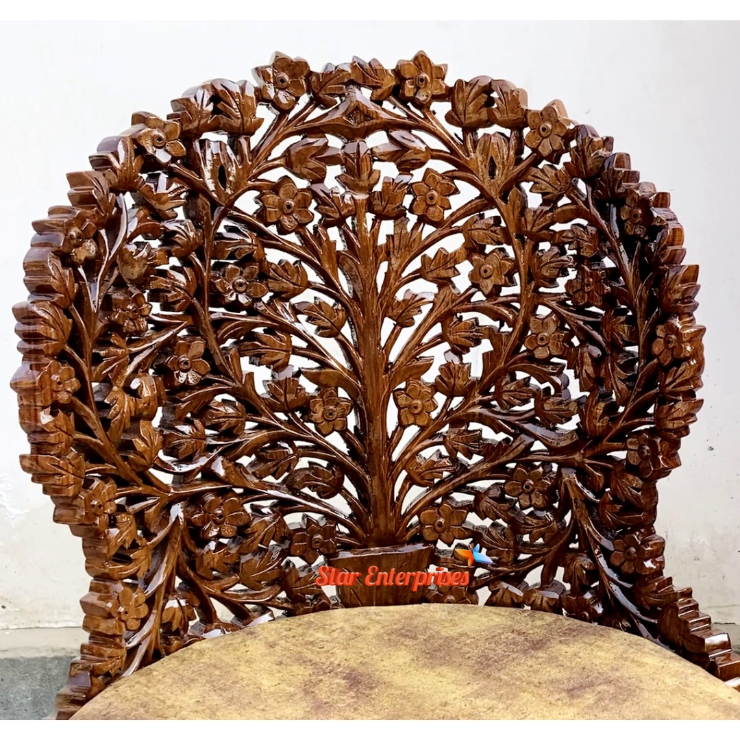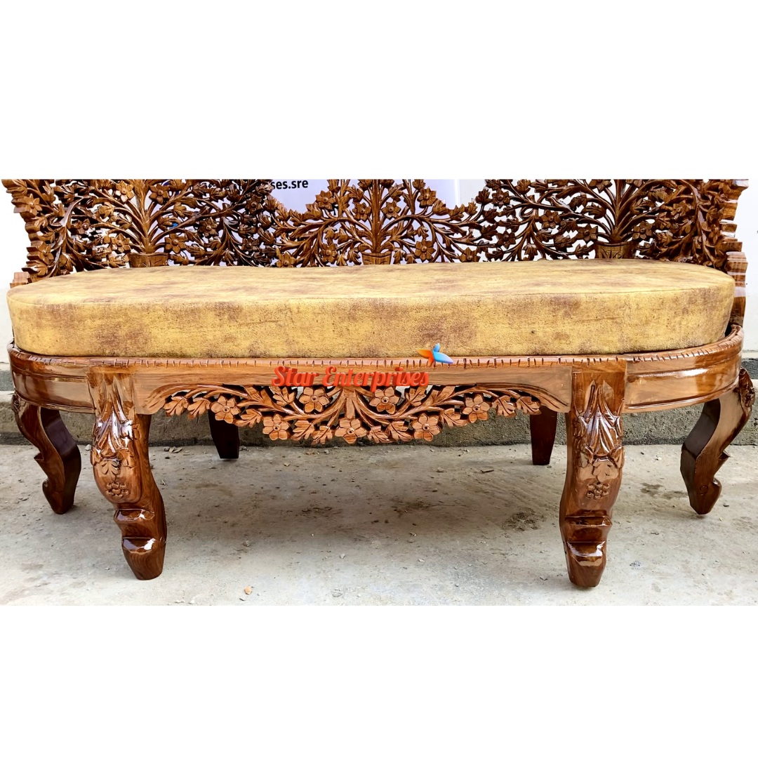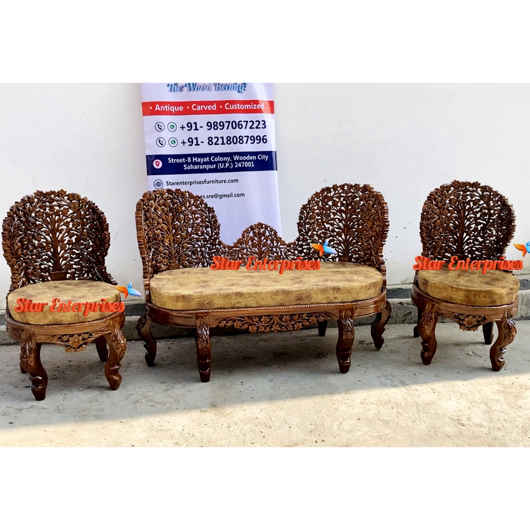 Wooded Carved Mudha Sofa Set by Star Enterprises is an outstanding piece of the traditional art mixed with the beautiful design. It is a gorgeous set made with an expertly designed tree-pattern backrest, made of high quality teak wood and this makes it look pretty. The carving of the openwork is very detailed and well made, which contributes more character and depth to the overall design. The furniture comprises of a stylish two seater sofa and two single chairs matched and all of the furniture is in the right balance of heavy carved legs and natural polish finish.
