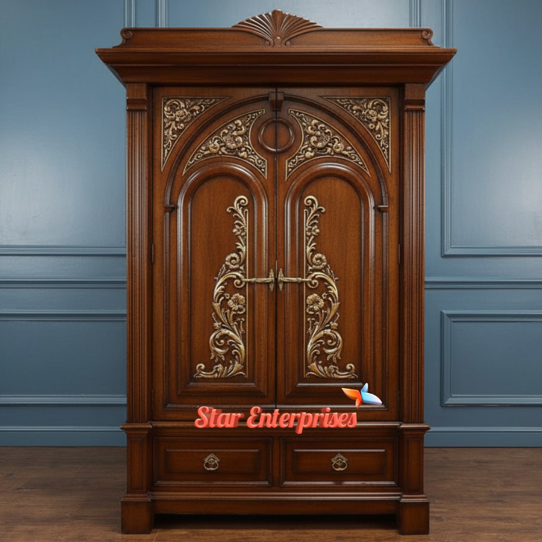 The Wooden Classic Almirah Design by Star Enterprise is a classic show of class and artistry, designed and made of high quality teak wood to give a royal touch to your interior decorations. The almirah will have a high-gloss finish of walnut antique which makes it more rich in terms of appearance and timeless. The doors are beautifully carved in hand, which is further embellished by the elegant shading done with gold which adds more luxurious touch.