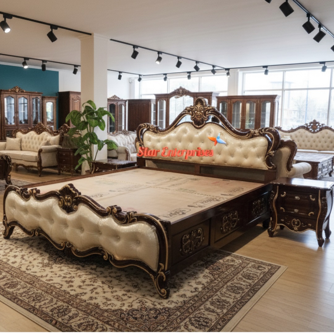 The Star Enterprises, Teak Wood Sleek Design Double Bed is a luxurious piece of furniture crafted from high-quality teak wood. The bed is polished in shiny walnut finish with a hint of gold. This bed featuring special light hand carvings on both the headboard and footer, adding a touch of sophistication and great artistry. To complementing the bed there are two bedside tables, each with three spacious drawers for your belongings.