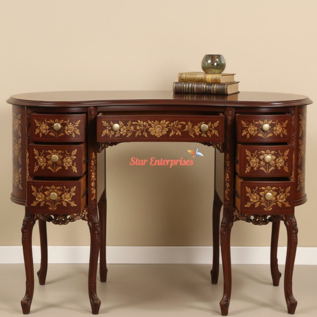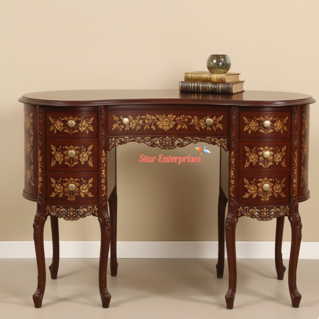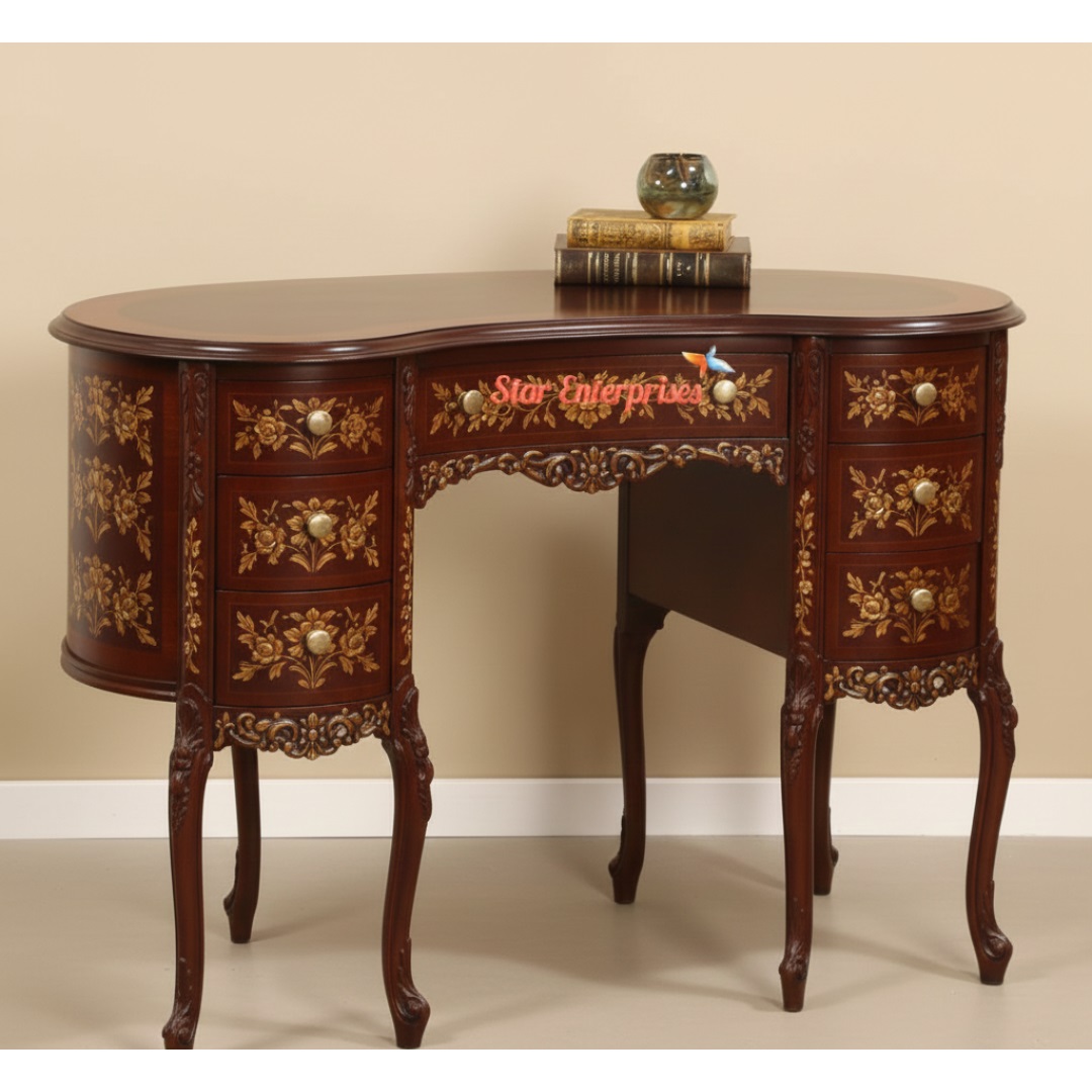 Wooden Classic European style Office Table, a product of Star Enterprises made in fine taste and with elegant artistry. This table is made of top grade solid teak wood, has a very stylish and smooth table top with perfectly cut legs that display a classic European style. Both sides have multiple drawers hand-carved with delicacies of floral handcrafted designs and high grade round knobs providing sufficient storage capacity of office supplies.