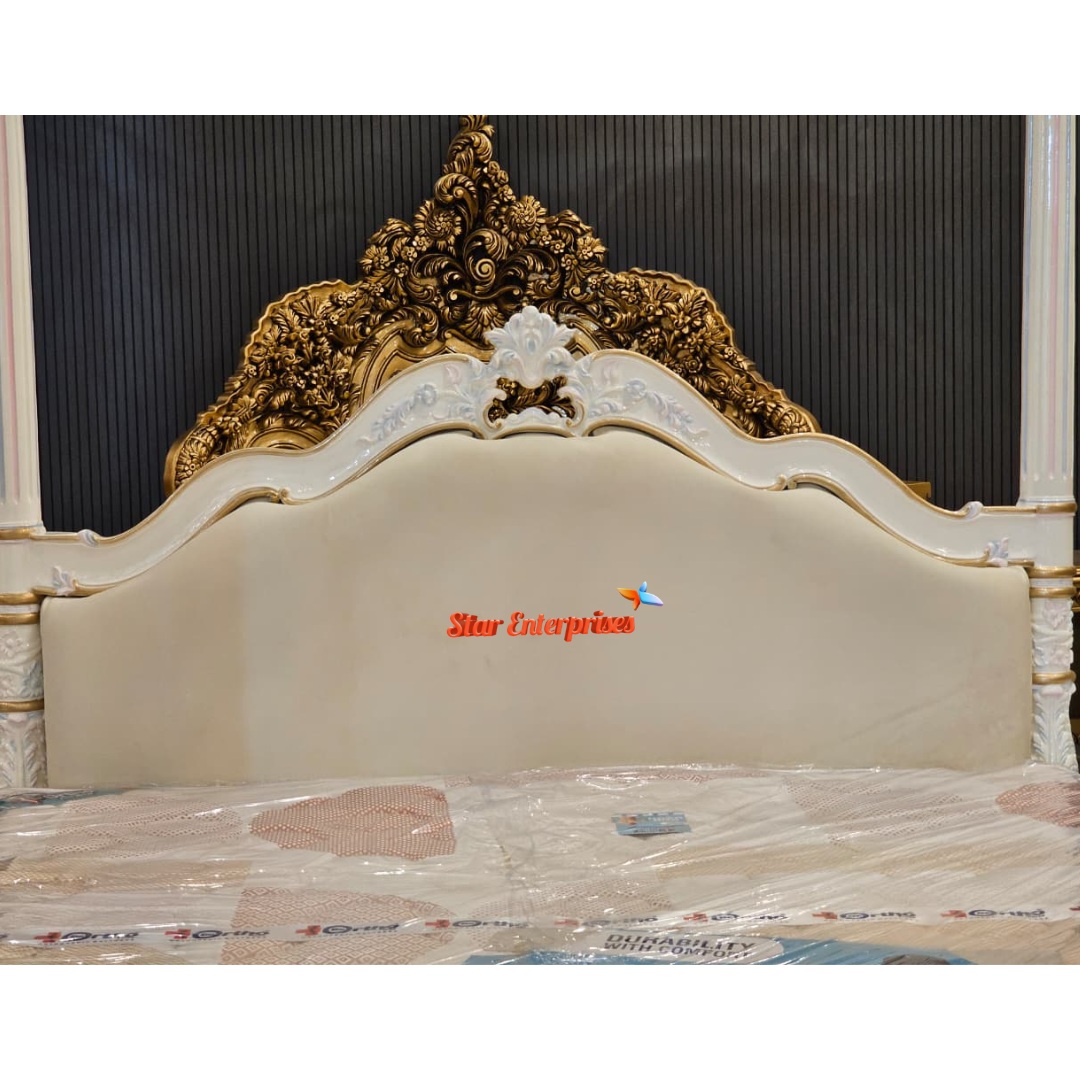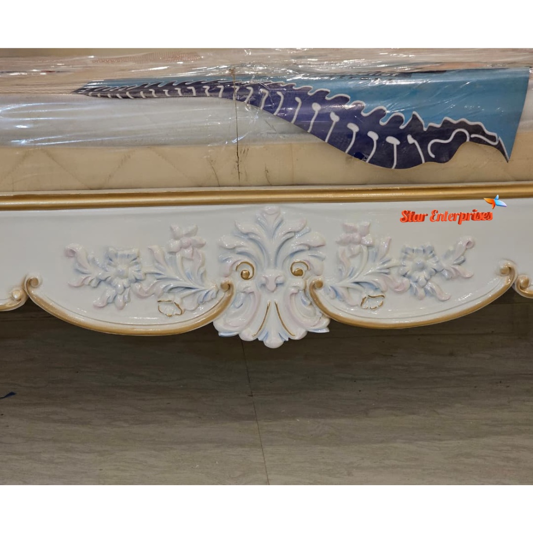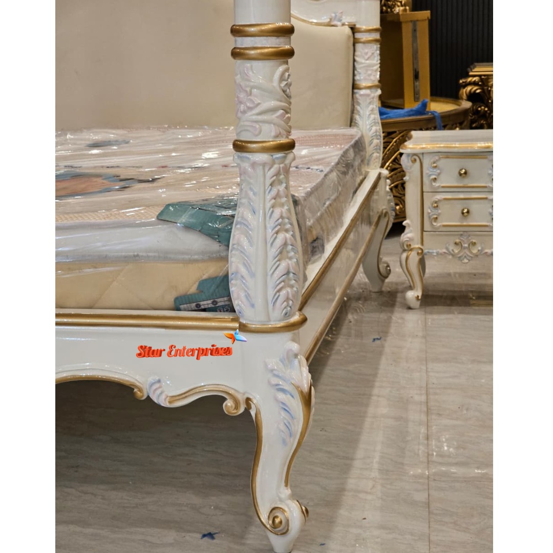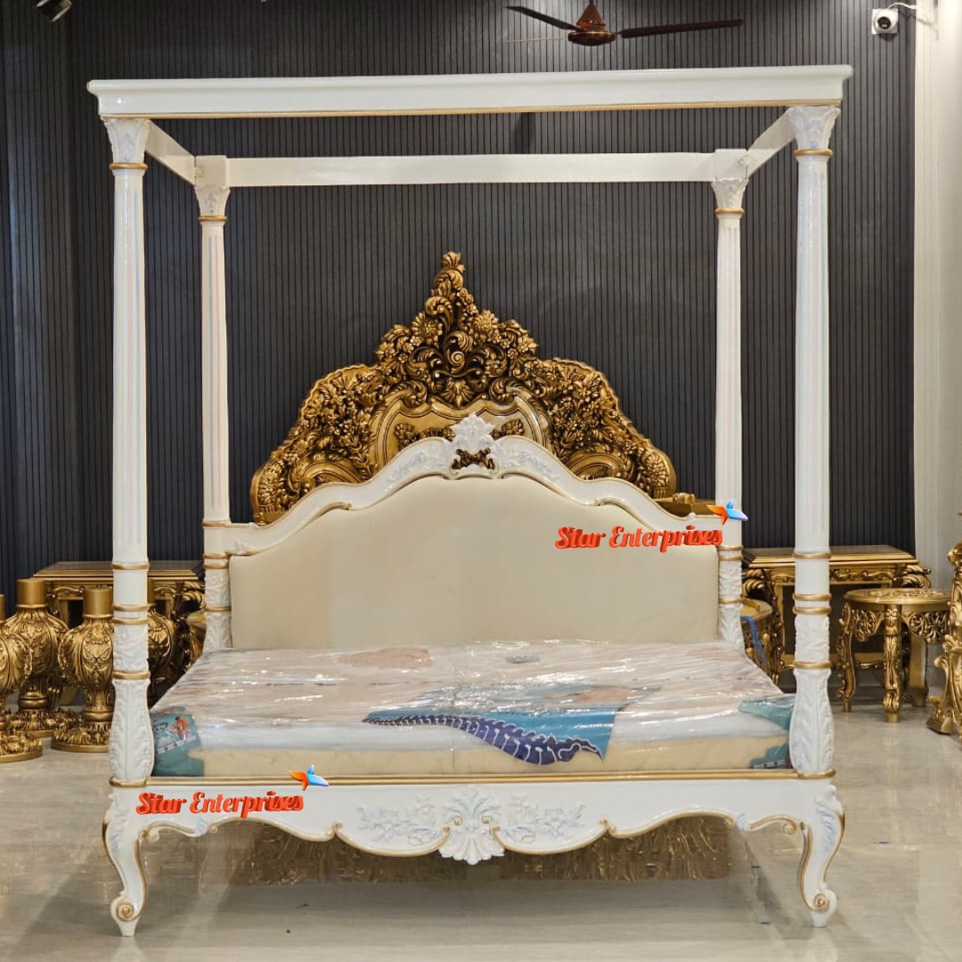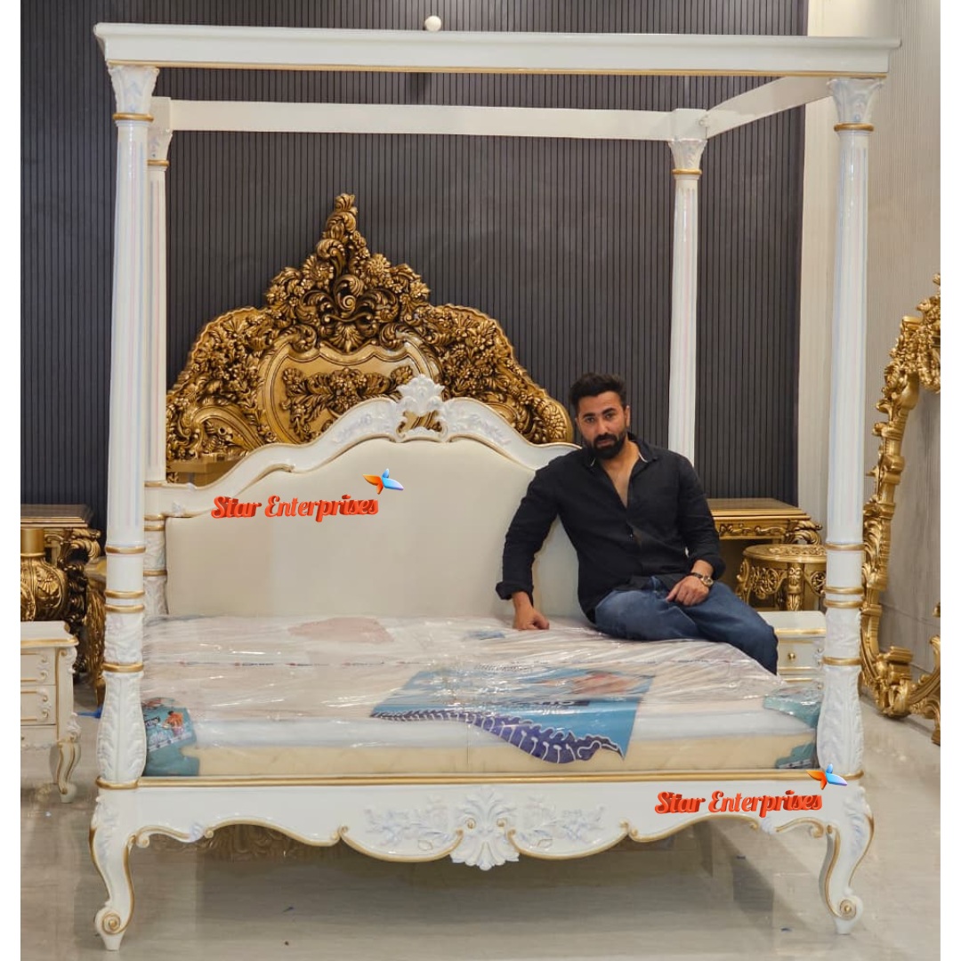 Star Enterprises Teak Wood Maharaja Four Poster Bed also known as कर्टन वाला बेड is made up of high quality and durable teak wood. The bed is finished in a gorgeous multicolour with high gloss white deco paint as the main colour and the slight traces of multicolour touches which make the bed look more like a royal one. The high pillars of the bed are beautifully decorated with multi colour artistic work through hand carving.