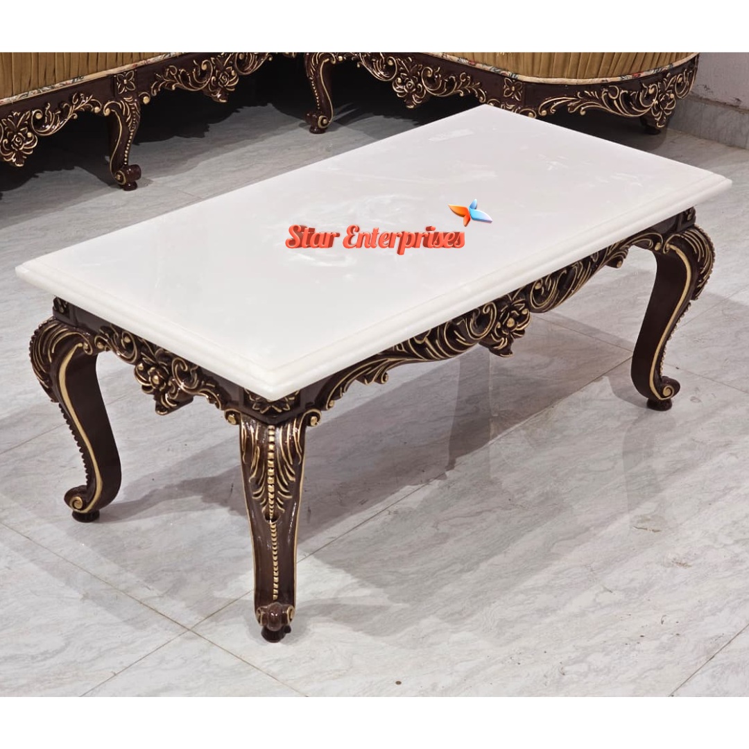 The sofa presents beautiful chain-style hand carving and elaborate carving on flowers, which are signs of good craftsmanship. It is light brown floral jacquard upholstered furniture that provides the benefit of bringing warmth and elegance to any living environment. The set also includes a centre table with an original white onyx stone top which is polished and carved like the sofa and creates the royal and elegant appearance of the set.