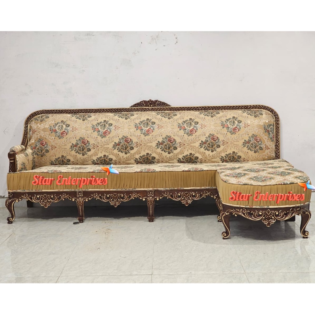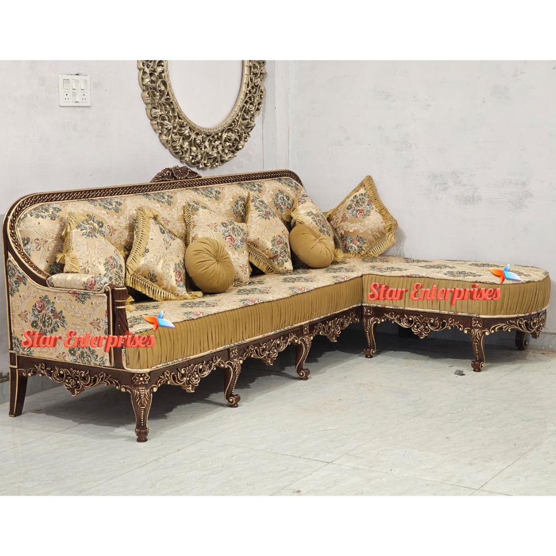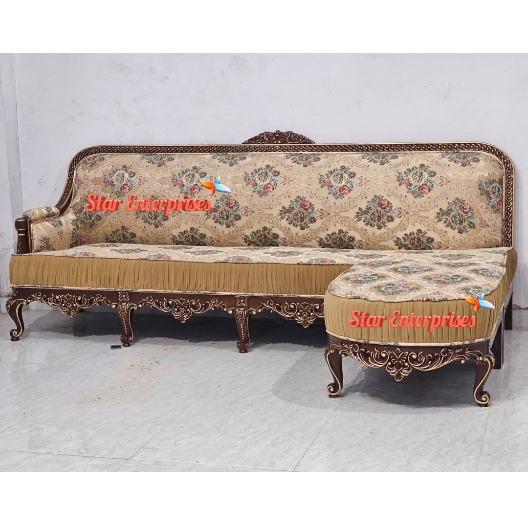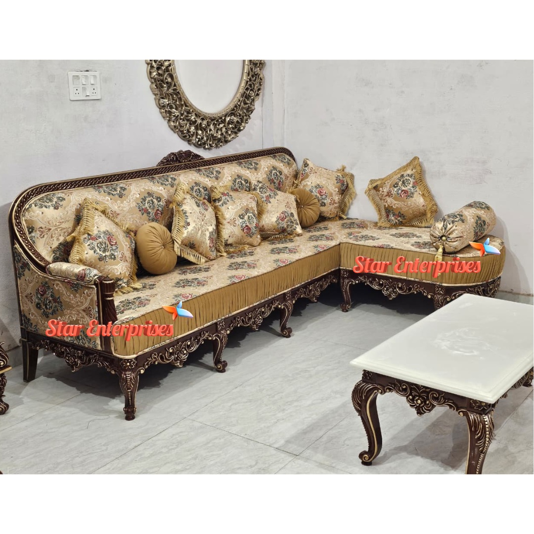 The Wooden Classic Sleek Work L-Shape Sofa by Star Enterprises is a perfect blend of elegance, durability and comfort. This is a premium sofa that is made of pure teak wood with a high-gloss walnut finish with a slight touch of gold shading that gives it a luxurious look. This corner sofa is designed to accommodate five people comfortably and is fitted with a high-density foam of 40, which can guarantee the maximum level of comfort and long durability.