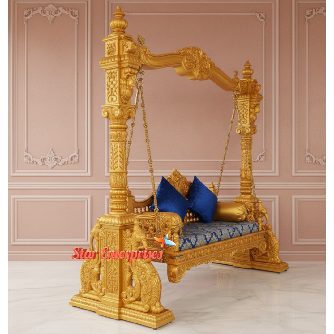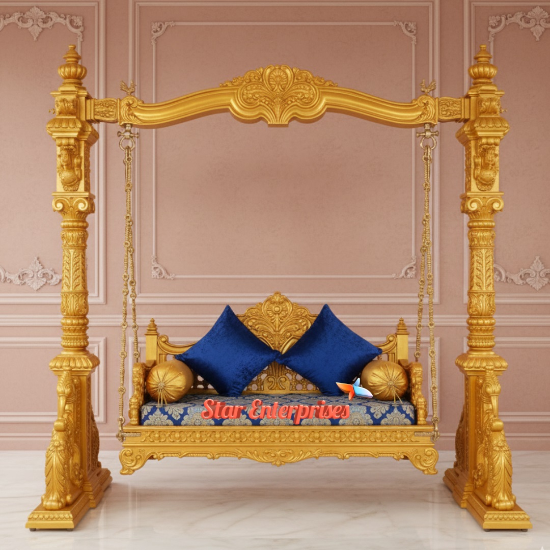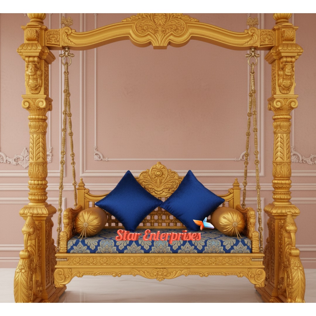 The Wooden Classic Swing designed by Star Enterprises is an epitome of luxury, tradition and royal craftsmanship. It has been expertly made using the finest teak wood, with extensive and elaborate hand carving on the pillars, frame and seating area. The swing is completed in a rich gold deco polish which gives it an aura of majesty and makes an addition to any interior decor.
