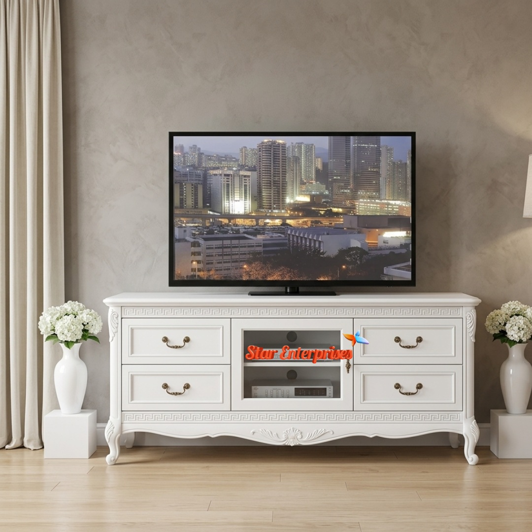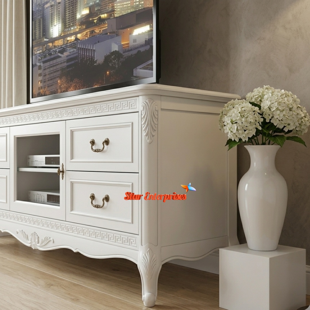 The Wooded Classic TV Unit by Star Enterprises Furniture is the symbol of the classic beauty and reliability. The unit is crafted out of quality teak wood, which has a pearl white finish that is very bright and gives a classy effect in the living room. The design is presented with very slight carved finishing on the edges and the bottom apron to give a very beautiful classic touch.