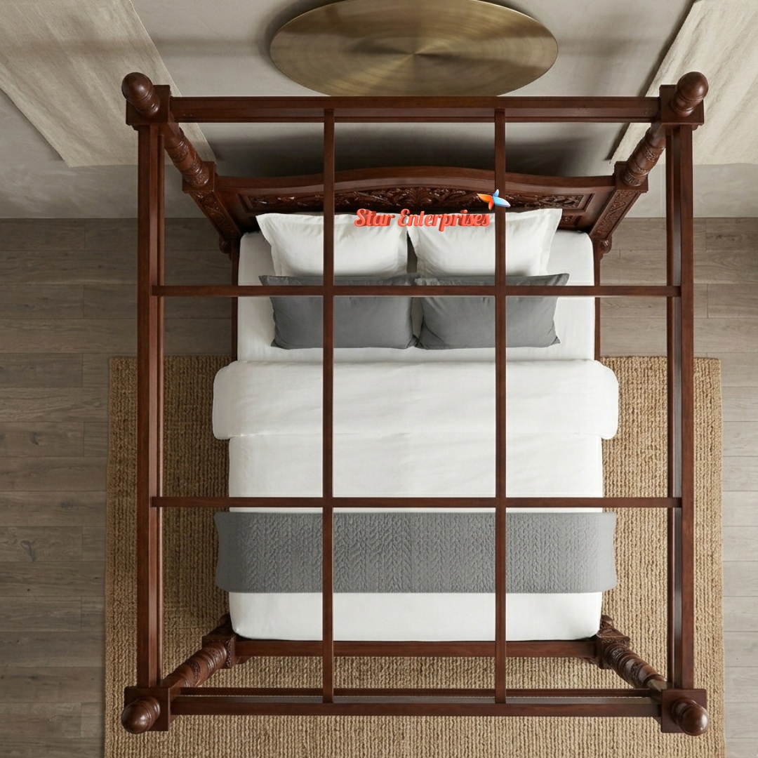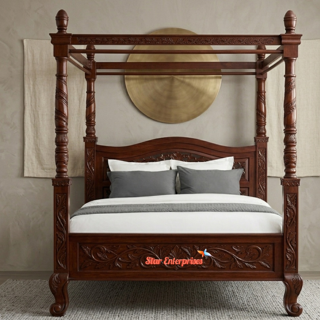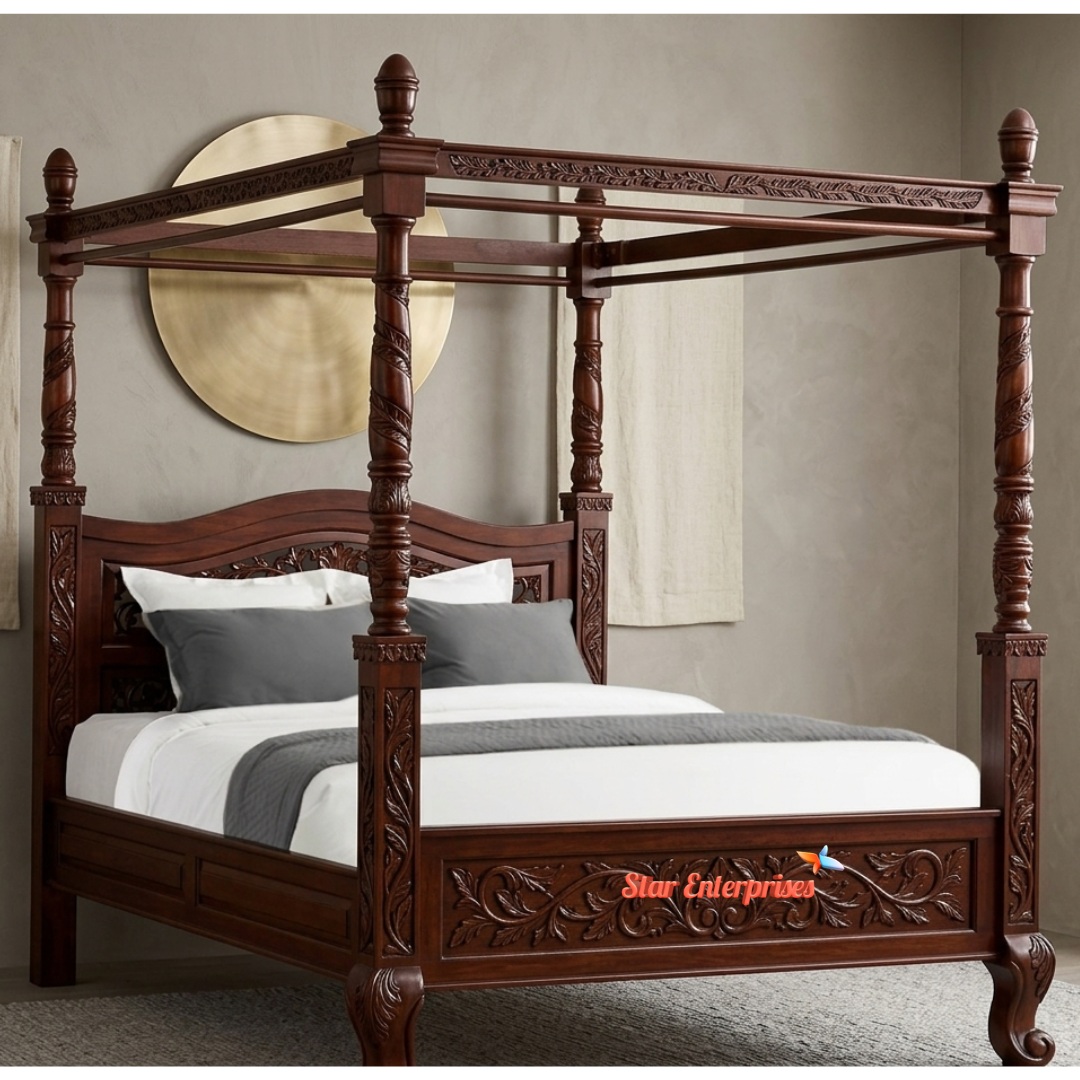 Star Enterprises the Wooded Colonial Style Poster Bed which is full of sophisticated heritage design and robust craftsmanship. The bed is created with teak wood and is deeply polished in walnut finish which adds a warm natural feel to it. The well-hewn headboard is exquisitely crafted in the typical colonial style in curvy contours and elaborate flower patterns. The bed has solid four posts with complicated hand-turned carvings that bring height, majesty and architectural stability to the building.
