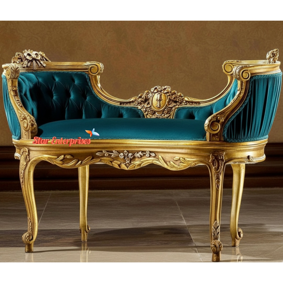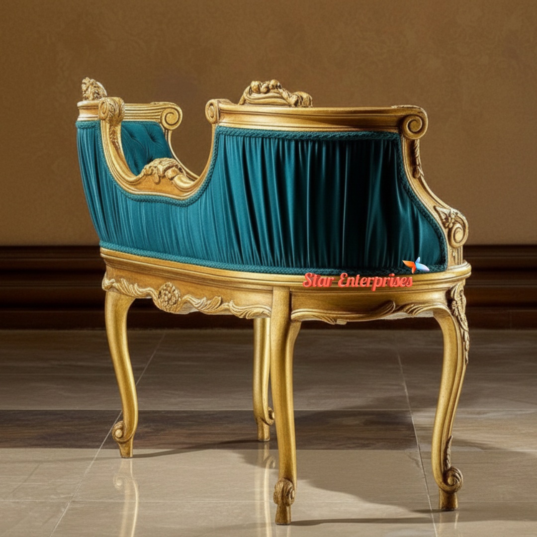 The Wooden French-Style Chaise Lounge by Star Enterprises is a classic combination of royal comfort and luxury. Made of quality teak wood, this masterpiece is a well-done hand carving that is based on the traditional style of French design, which is related to the delicacy of the experienced carvers. The chaise is complete with a high-gloss gold finish, making it look more royal and thus a featured workpiece in any high-end interior.
