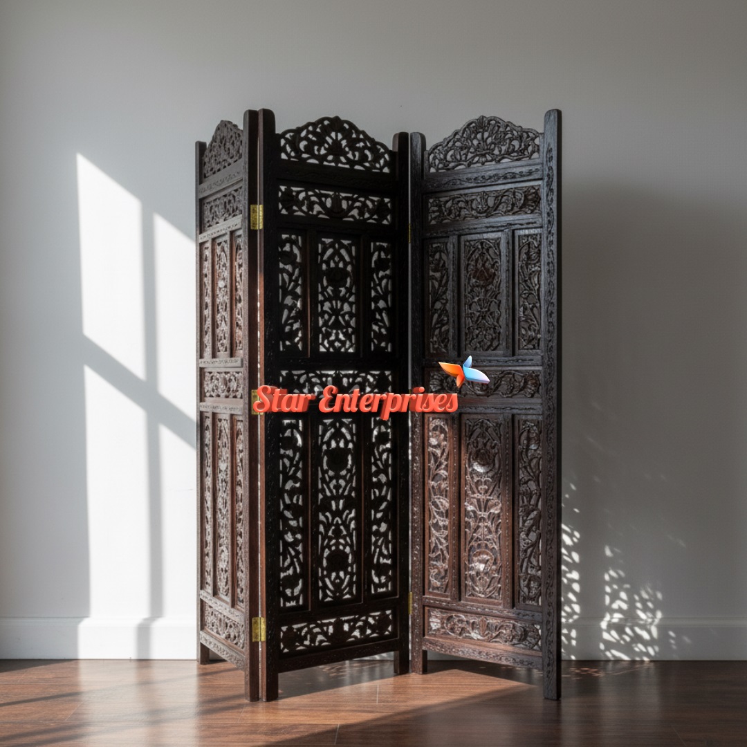The dark matte polish on it makes the carving more detailed and adds a luxurious but antique look to it. This room divider is ideal in making a stylish personal space or beautifying interior decorations of any room as it has both functional and aesthetic value. A real representation of old art mixing with new applications by Star Enterprises.