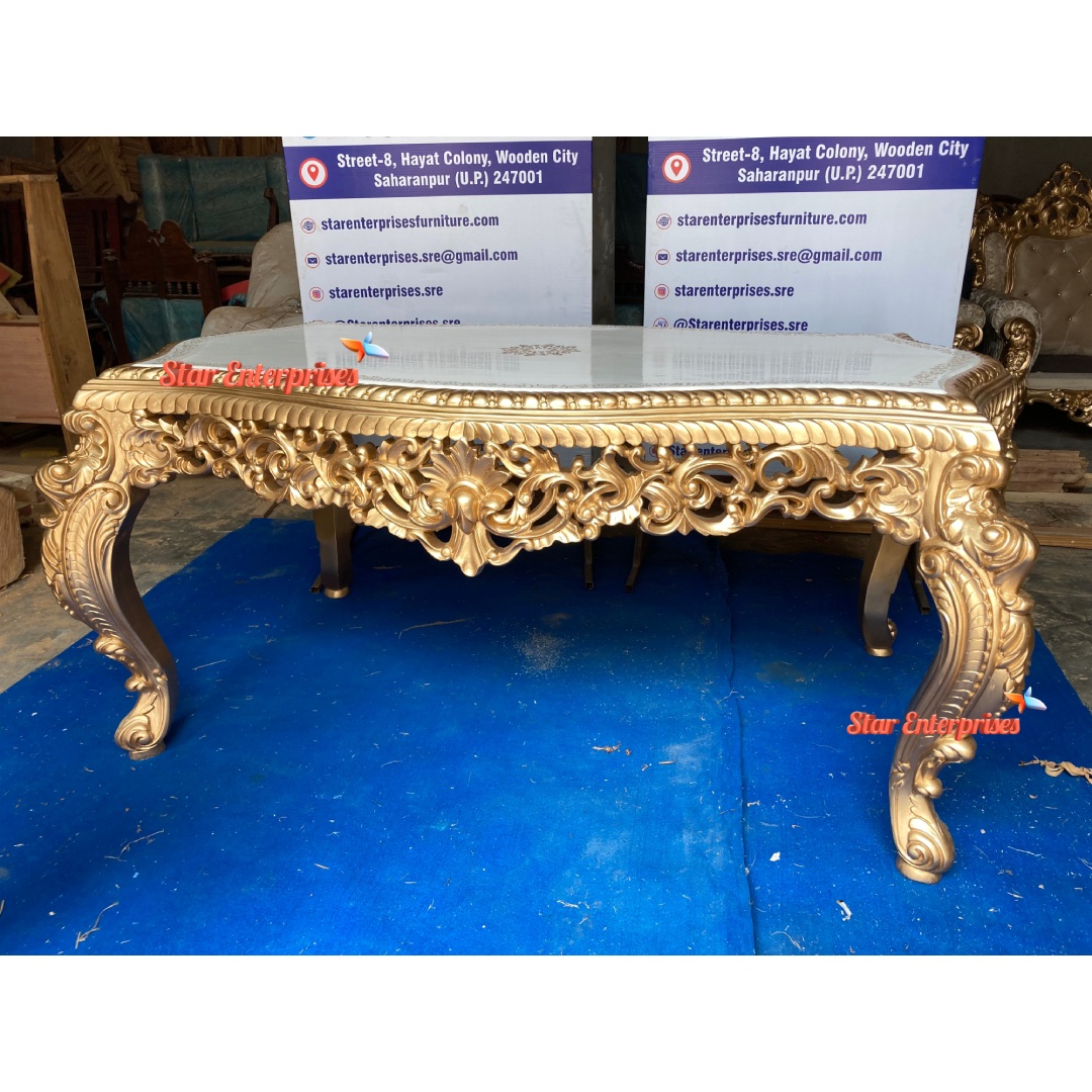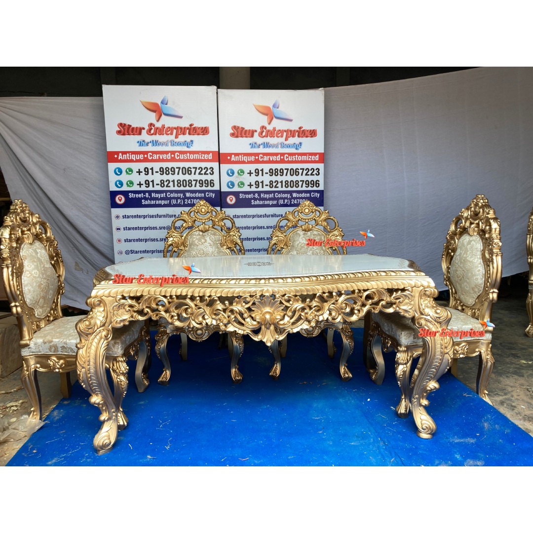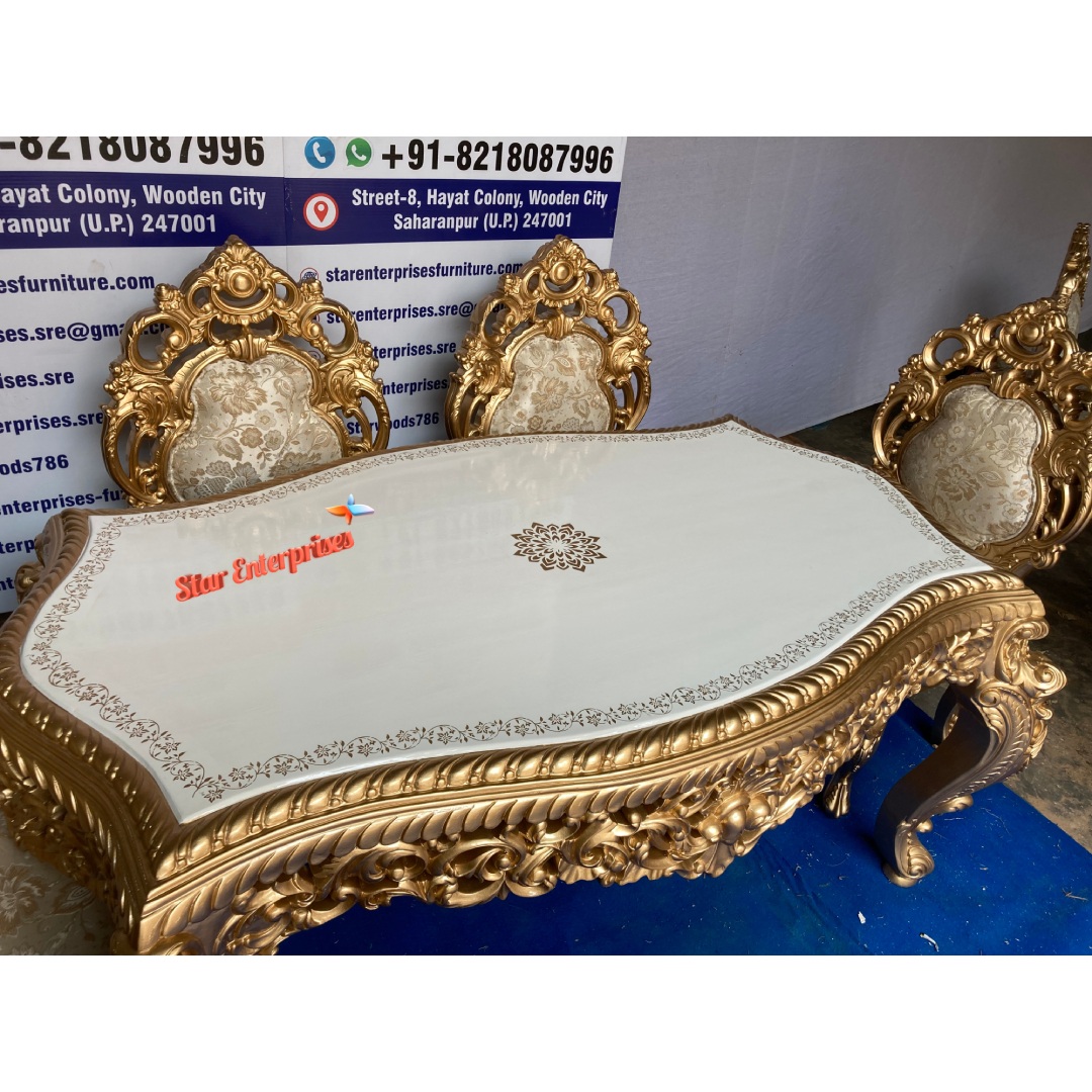 The Wooden Royal Dining Table Set from Star Enterprises is looking very beautiful and brings richness and elegance. Crafted out of durable and elegant teakwood, this dining set features a royally glossy gold finish for that luxury feel. The table is rectangular and has white color wooden top and is capable of accommodating six people thus, it great for family dinners or even a small group of friends. Beautiful floral hand carvings on the legs and sides of the table in gold finish enhance the overall look of the set.