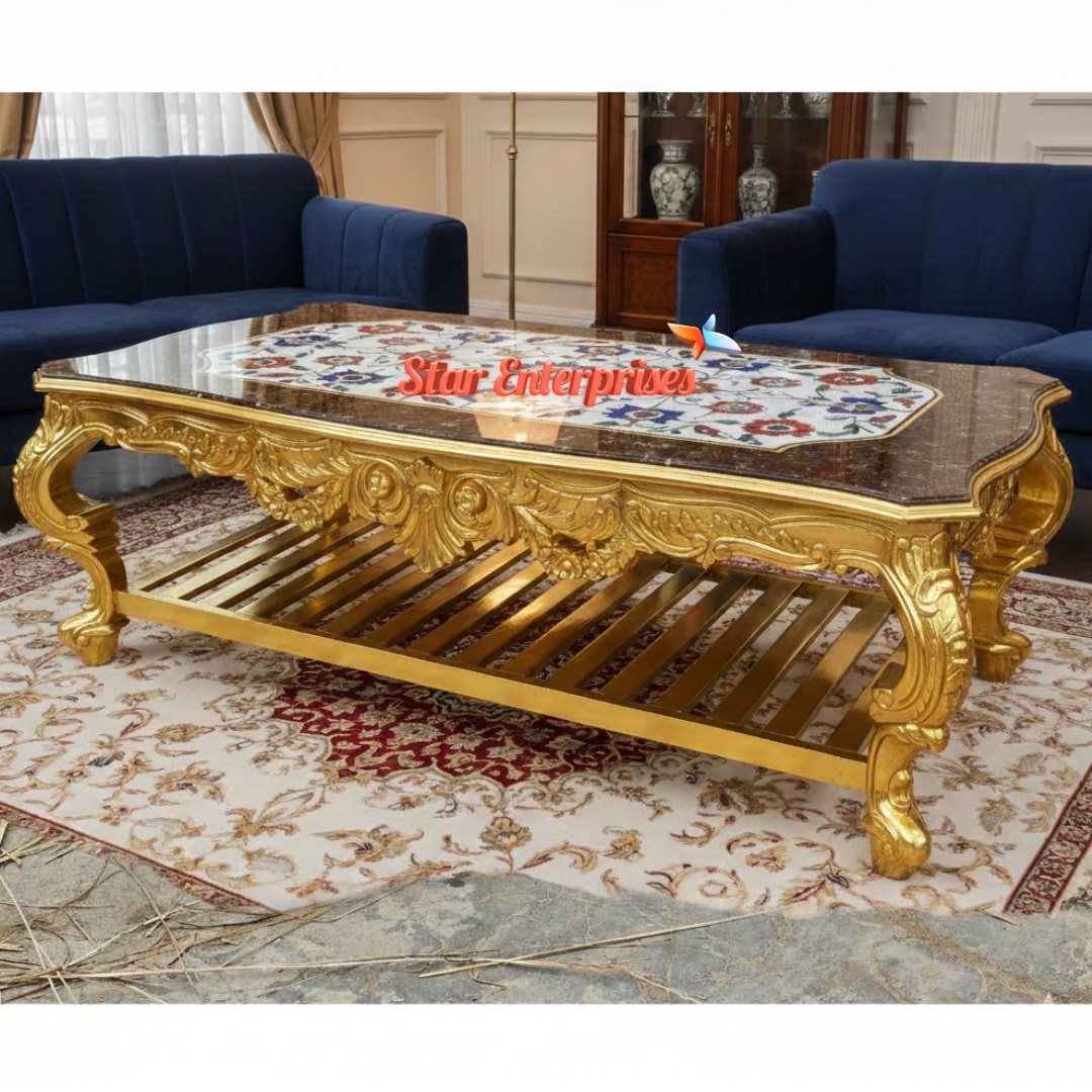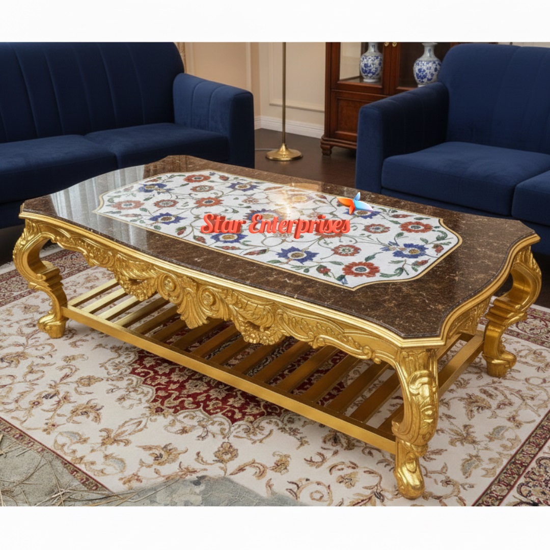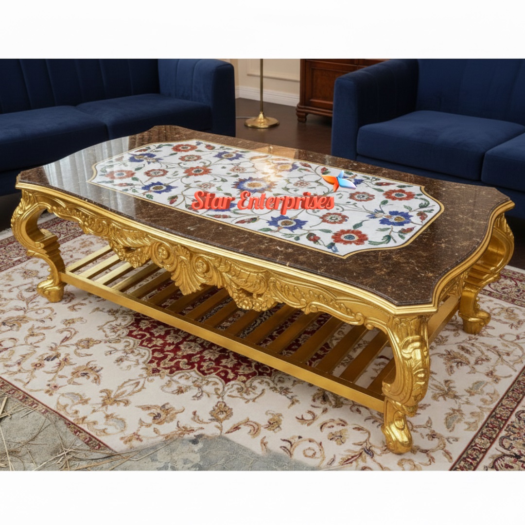 Topped with a pristine floral print onyx stone surface, it offers a striking contrast to the rich wood, enhancing its luxurious appeal. Ideal for modern & classic interiors, this table is both stylish durable, making it a practical centerpiece for your living room. Whether for casual gatherings or formal settings, the Wooden Handcrafted Luxury Table adds timeless beauty and utility to your home.
