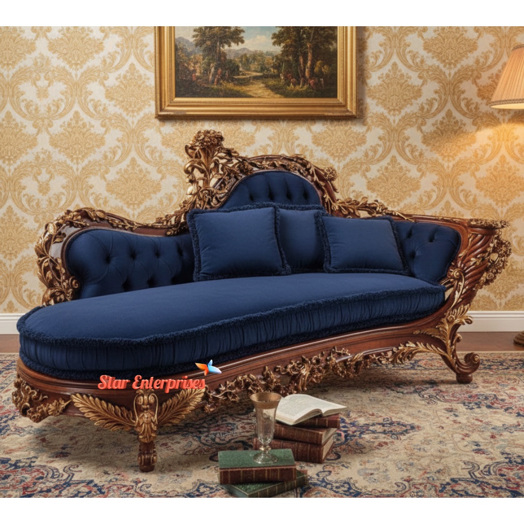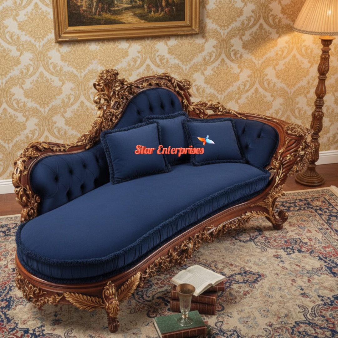 Wooden Luxury Chaise Lounge by Star Enterprises is an ideal mixture of royal and ultimate comfort. Made of high-standard teak wood, this masterpiece illustrates a beautiful hand carving representing the traditional art. The chaise lounge has a high-gloss finish of walnut that looks very beautiful, with a slight touch of gold polish, which provides the royalism. It is comfortable, relaxed, and has 40-density cushioning, which is great support and long seating comfort.