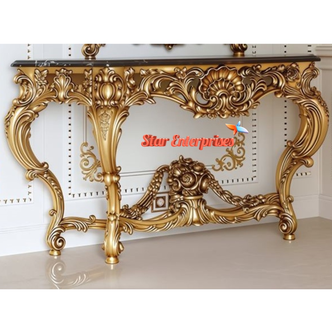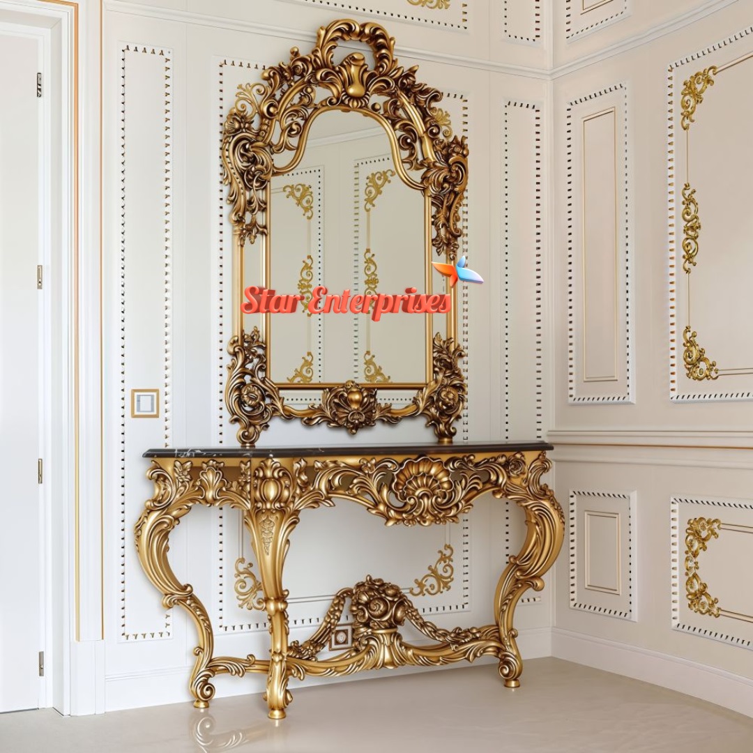 Wooden Luxury Console Table is a masterpiece made in high quality of teak wood, which is guaranteed to bring greatness and beauty to any given interior. This ensemble comprises of a very beautiful carved console table that is matched with an enormous mirror frame that is equally beautiful. The works have complicated hand-carving work by highly skilled craftsmen and they have a floral and royal pattern emphasizing the real skills.