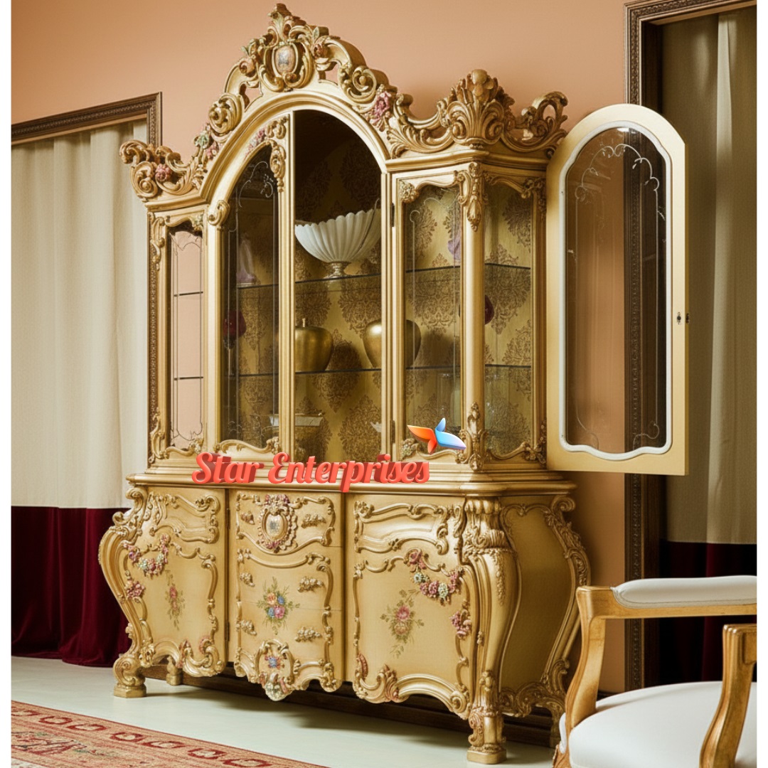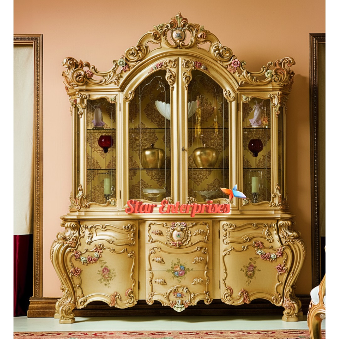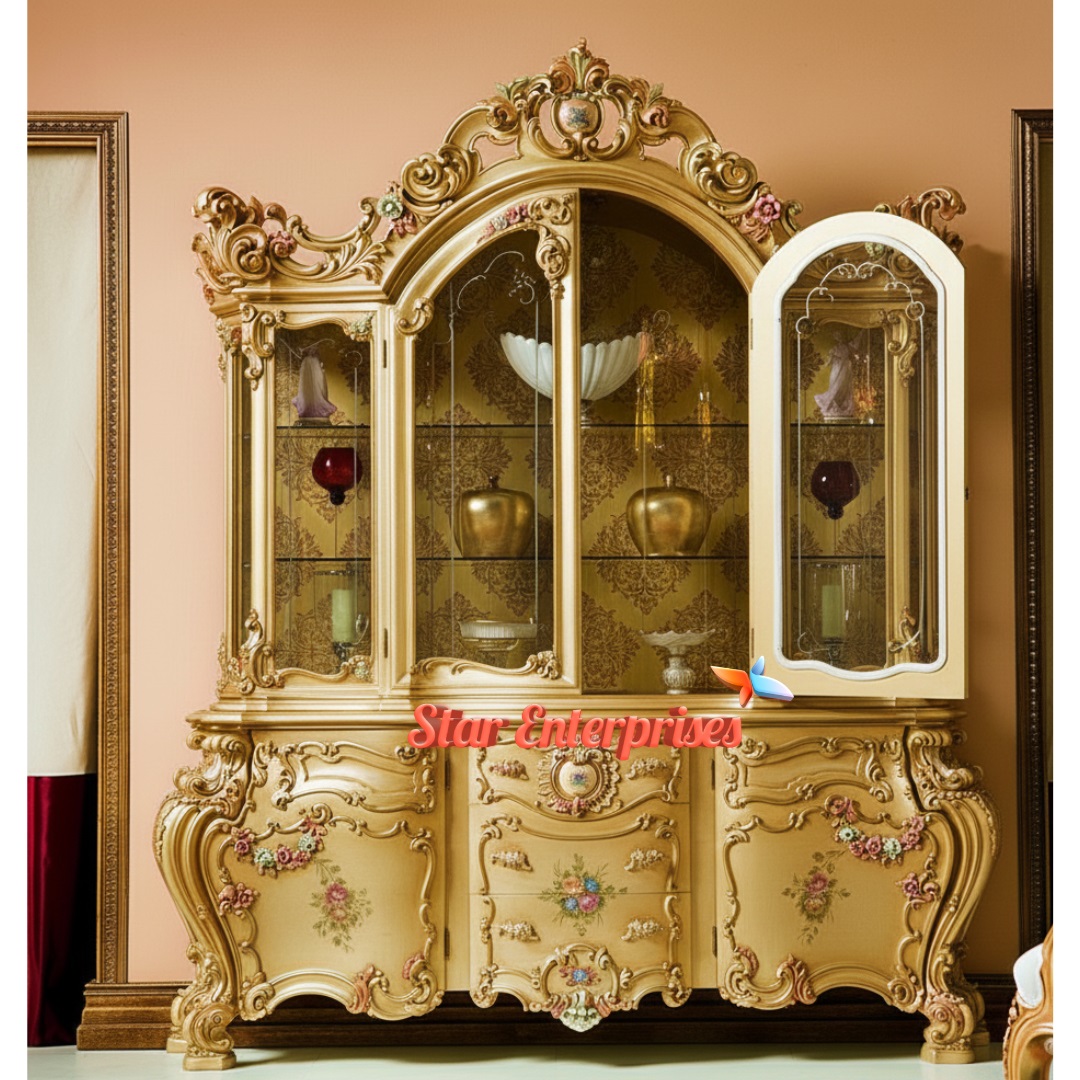 The unit has large glass cabinets to showcase crockery, adornments and other collectibles and has numerous drawers to store safely. It can be used in any dining or livings area to provide a luxurious touch due to floral art and streamlined designs. An ideal combination of fashion, power and royalty to your ideal house.