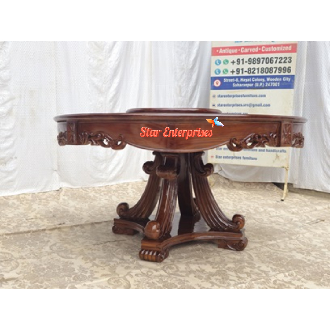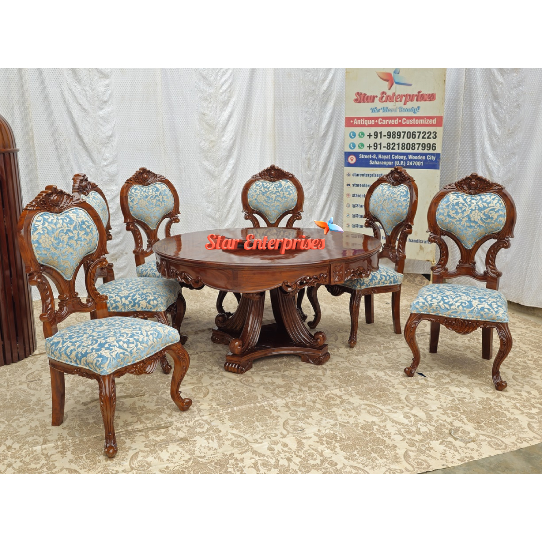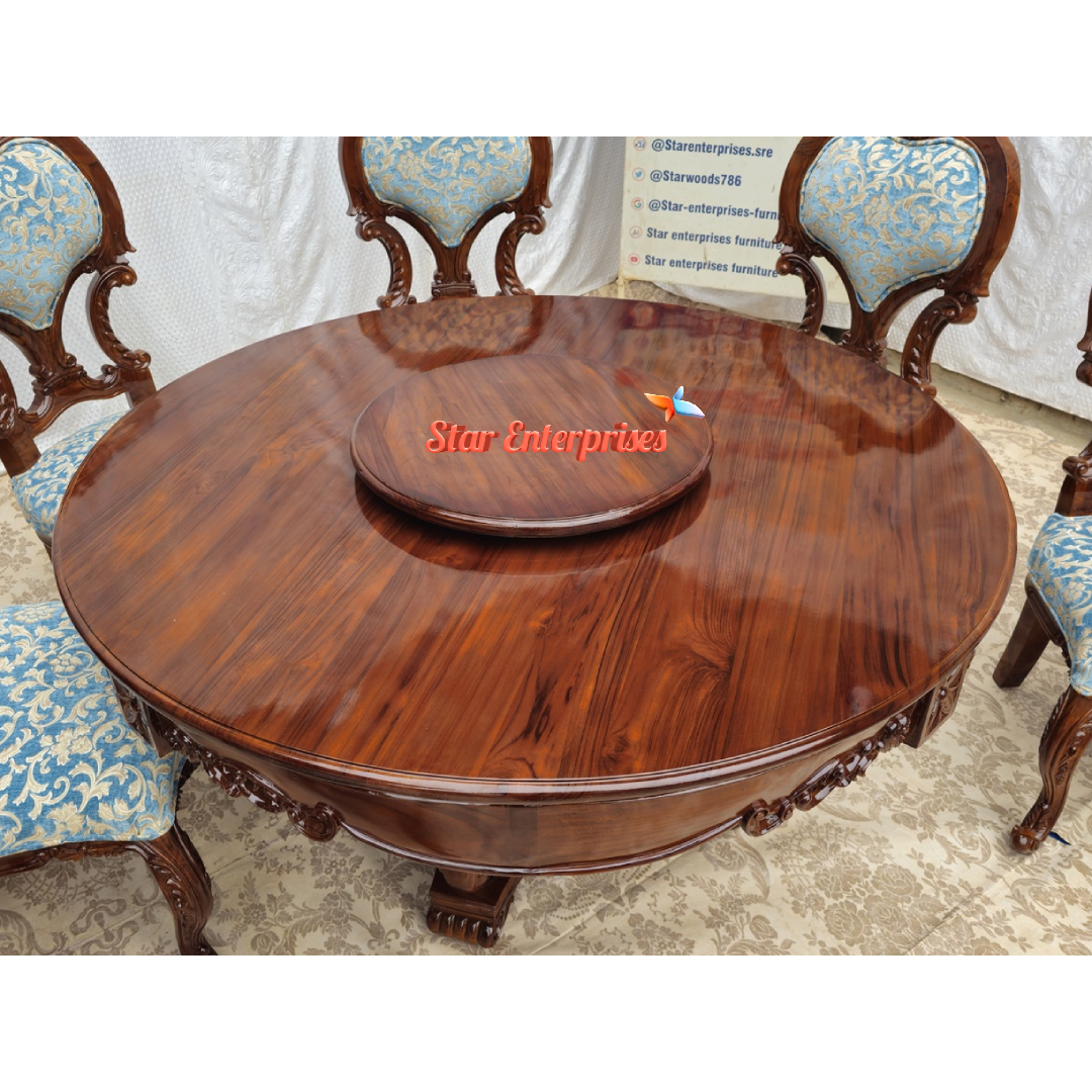 Star Enterprises introduces the Wooden Round Classic Dining Set made from the quality Teak Wood. This dining set is made from the traditionally carved hardwoods and is coated in a high gloss brown polish. There is a round dining table which can accommodate six people, it can be also used for a family dinners.