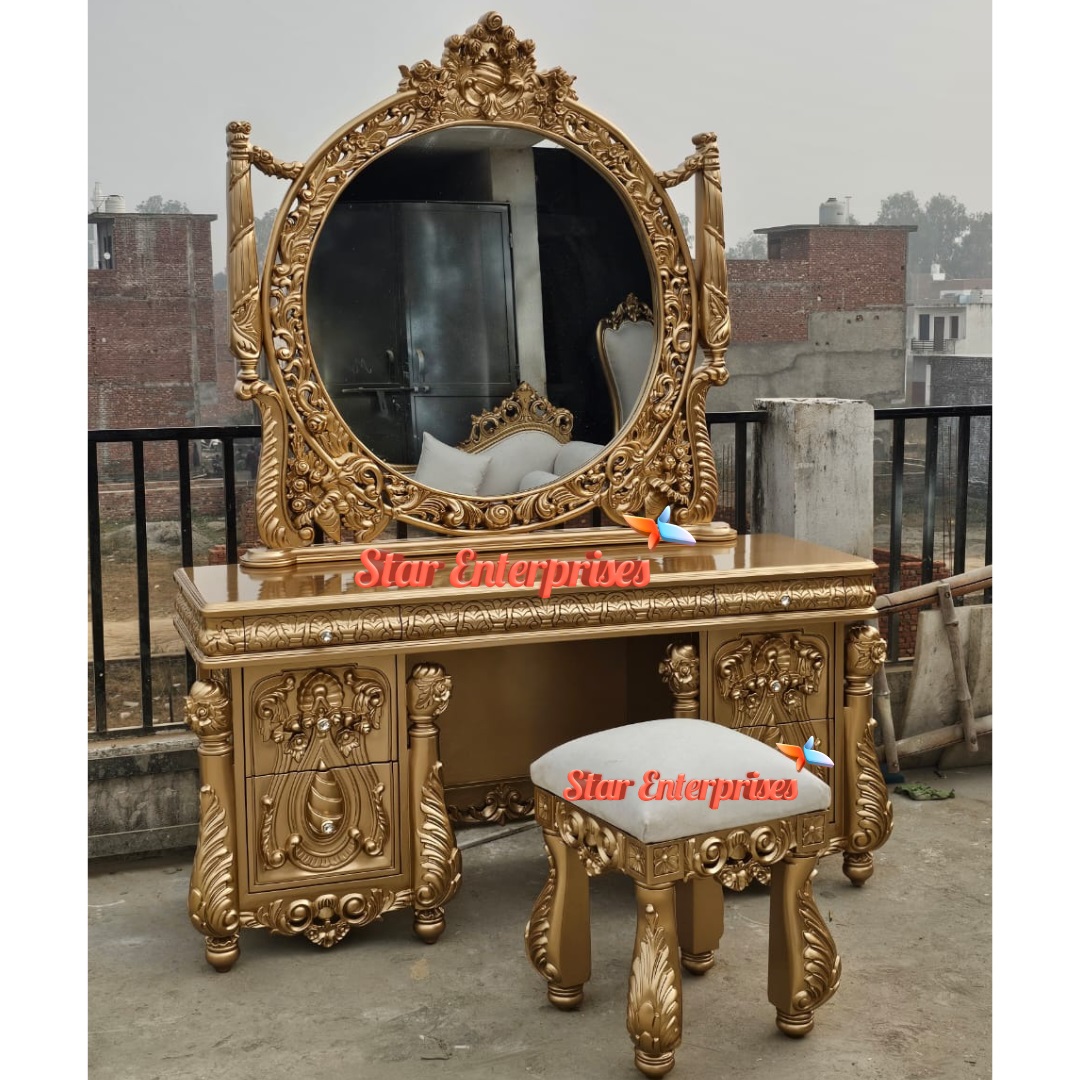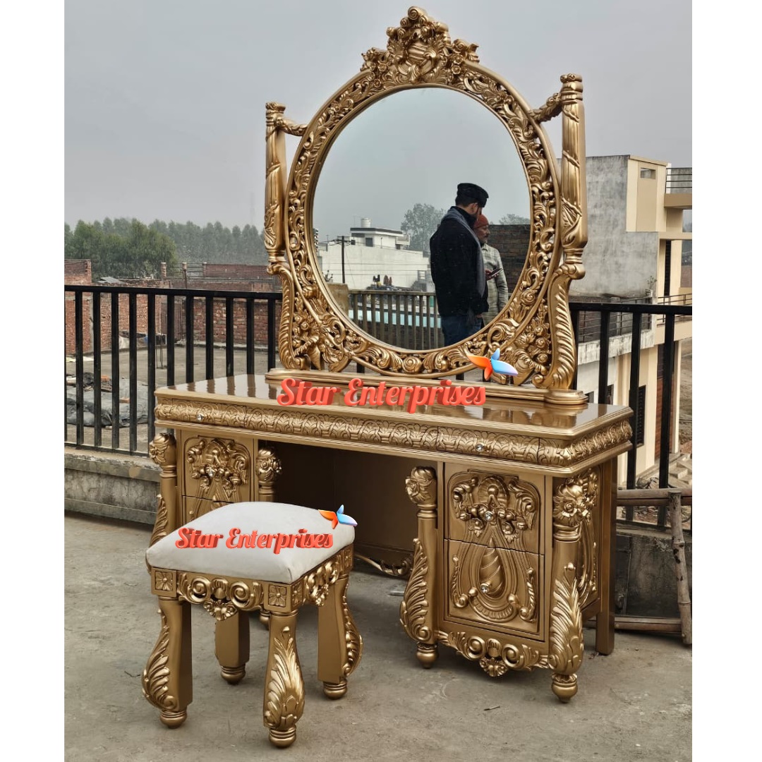 This is the Star Enterprises Wooden Royal Handcrafted Dressing Table made of the finest teak wood to give a royal, luxurious look. The table, as well as the frame of the mirror, has excellent quality and stunning 3D pattern floral hand carving. Finished in shiny gold polish, it will help to bring royal spirit to any bedroom or dressing room. The design has a round cut-out for a mirror that also has this rather luxurious look and there is also a stool that matches this as well.