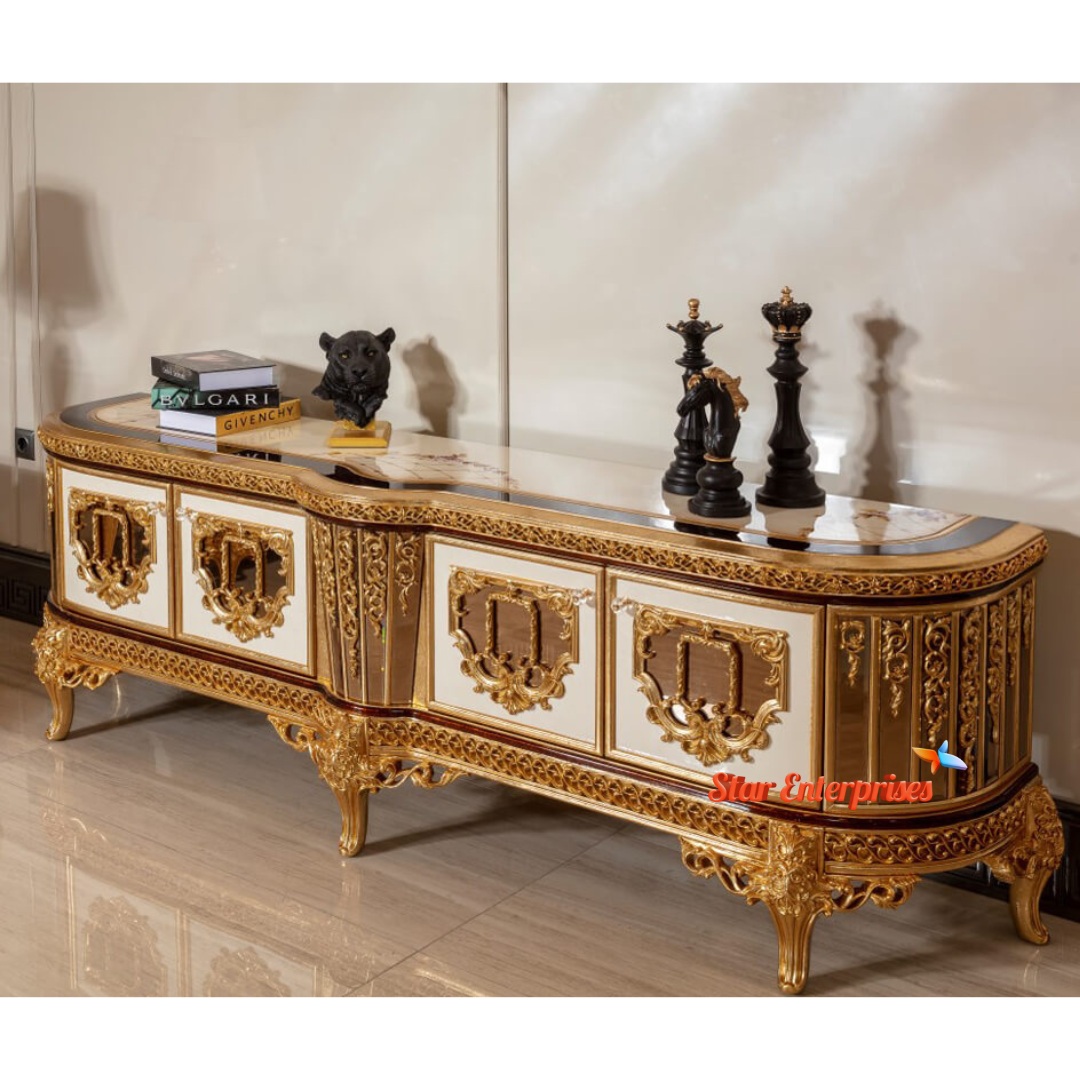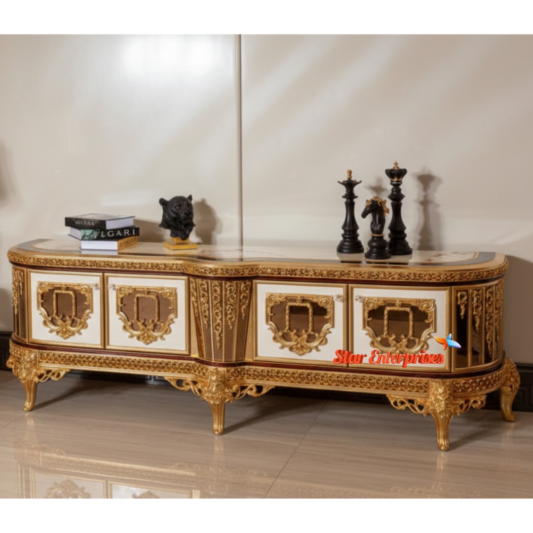 The Wooden Royal Handcrafted TV Unit by Star Enterprises is really nice because it is a perfect piece of luxury & wood art. It is made from high quality teak wood, which makes it look beautiful and last a long time. This TV unit is polished in high gloss gold polish with a hint of white deco & walnut finish, which makes it look very fancy.