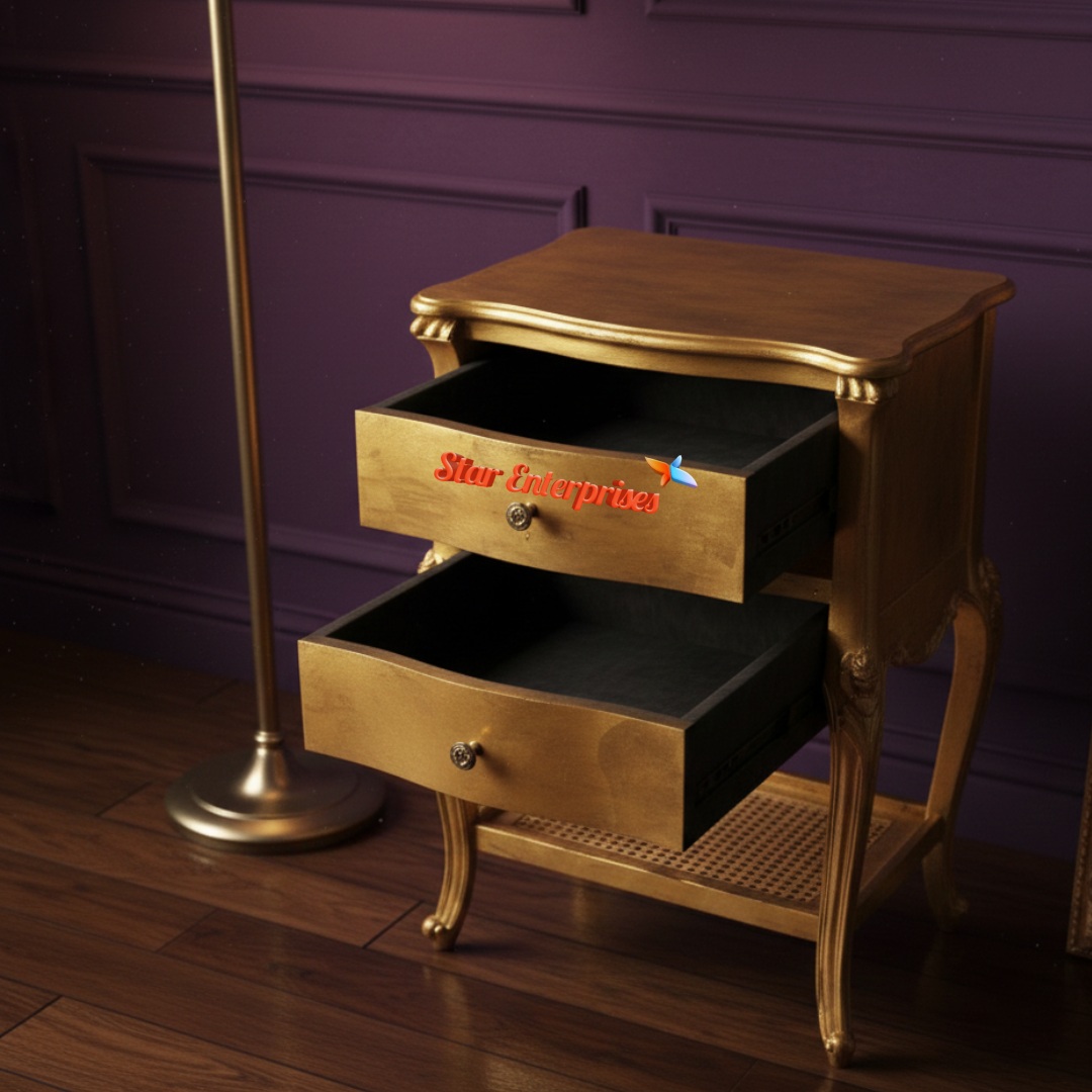 The Sleek Design Bedside Table by Star Enterprises is a combination of an ideal blend of style, strength and functionality. It is a well-designed bedside table, crafted from high quality teak wood. It is finished in high-gloss gold finish that is luxurious and adds to the charm of its elegant and contemporary look.