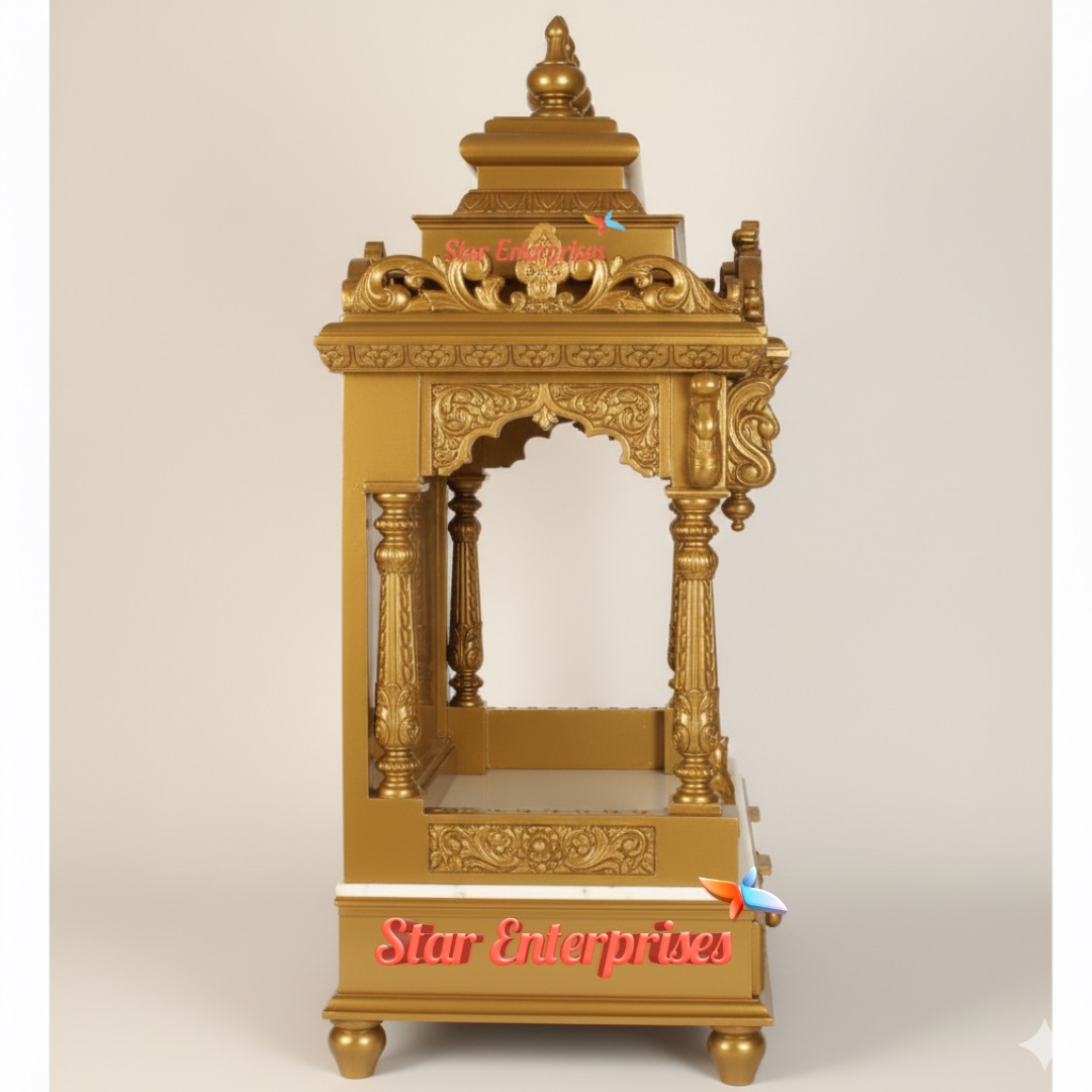 The design of Star Enterprises Wooden Traditional Temple Design cuts across lavishness in its high gloss golden polish with a touch of divinity to any place. Designed with a highly prominent intricately carved roof with traditional architecture. The primary space is enclosed by strong, extremely extensive pillars, decorated with classical figures. There is a well molded arch with flowing designs above the main opening which contributes to its dazzling style.