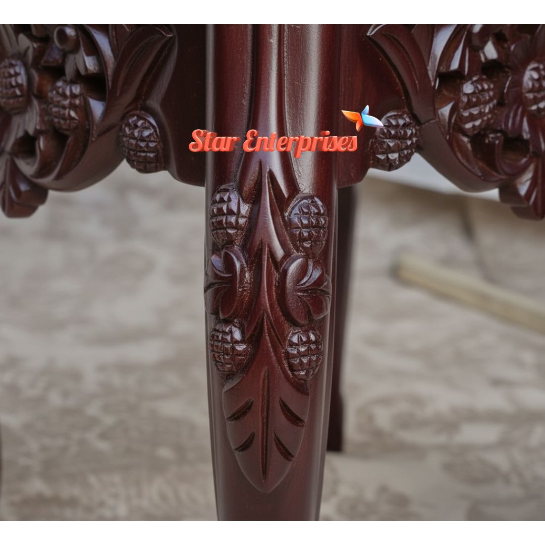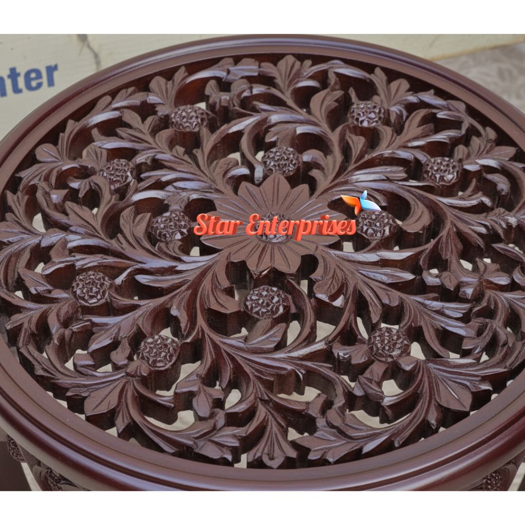 The Wooden Antique Carved Side Table by Star Enterprises is a perfect combination of traditional design and quality work. Crafted from select teak wood, this side table polished in high gloss walnut finish to offer a high-end look. It has intricate hand-carved work on the tabletop as well as on the legs, part of the design of the table.